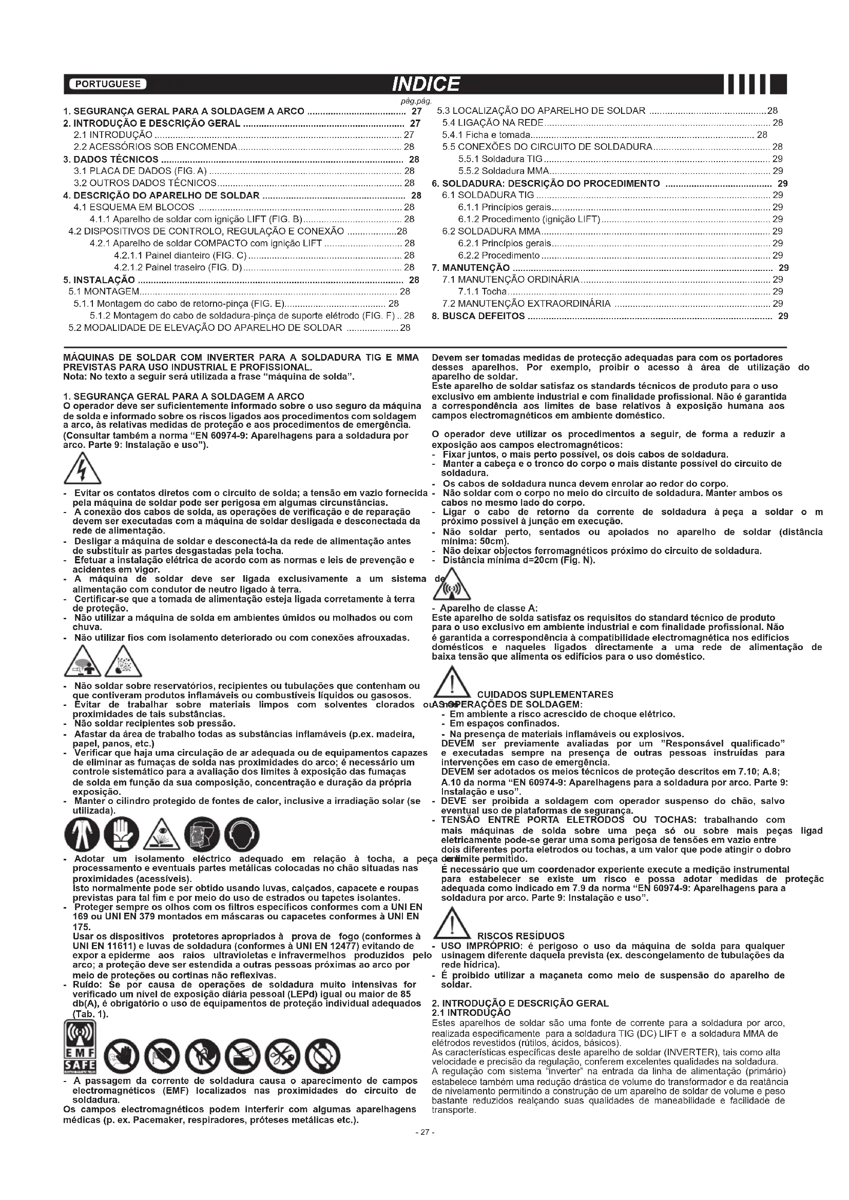 8.BUSCADEFEITOS.............................................................................................. 29 MÁQUINAS DE SOLDAR COM INVERTER PARA A SOLDADURA TIG E MMA PREVISTASPARAUSOINDUSTRIALEPROFISSIONAL. Nota:Notextoaseguirseráutilizadaafrase“máquinadesolda”. 1.SEGURANÇAGERALPARAASOLDAGEMAARCO Ooperadordevesersucientementeinformadosobreousosegurodamáquina de solda e informado sobre os riscos ligados aos procedimentos com soldagem aarco,àsrelativasmedidasdeproteçãoeaosprocedimentosdeemergência. (Consultartambémanorma“EN60974-9:Aparelhagensparaasoldadurapor arco.Parte9:Instalaçãoeuso”). - Evitaroscontatosdiretoscomocircuitodesolda;atensãoemvaziofornecida pelamáquinadesoldarpodeserperigosaemalgumascircunstâncias. - Aconexãodoscabosdesolda,asoperaçõesdevericaçãoedereparação devemserexecutadascomamáquinadesoldardesligadaedesconectadada rededealimentação. - Desligaramáquinadesoldaredesconectá-ladarededealimentaçãoantes desubstituiraspartesdesgastadaspelatocha. - Efetuarainstalaçãoelétricadeacordocomasnormaseleisdeprevençãoe acidentesemvigor. - A máquina de soldar deve ser ligada exclusivamente a um sistema de alimentaçãocomcondutordeneutroligadoàterra. - Certicar-sequeatomadadealimentaçãoestejaligadacorretamenteàterra deproteção. - Nãoutilizaramáquinadesoldaemambientesúmidosoumolhadosoucom chuva. - Nãoutilizaroscomisolamentodeterioradooucomconexõesafrouxadas. - Nãosoldarsobrereservatórios,recipientesoutubulaçõesquecontenhamou quecontiveramprodutosinamáveisoucombustíveislíquidosougasosos. - Evitar de trabalhar sobre materiais limpos com solventes clorados ou nas proximidadesdetaissubstâncias. - Nãosoldarrecipientessobpressão. - Afastardaáreadetrabalhotodasassubstânciasinamáveis(p.ex.madeira, papel,panos,etc.) - Vericarquehajaumacirculaçãodearadequadaoudeequipamentoscapazes deeliminarasfumaçasdesoldanasproximidadesdoarco;énecessárioum controlesistemáticoparaaavaliaçãodoslimitesàexposiçãodasfumaças desoldaemfunçãodasuacomposição,concentraçãoeduraçãodaprópria exposição. - Manterocilindroprotegidodefontesdecalor,inclusiveairradiaçãosolar(se utilizada). - Adotar um isolamento eléctrico adequado em relação à tocha, a peça em processamentoeeventuaispartesmetálicascolocadasnochãosituadasnas proximidades(acessíveis). Istonormalmentepodeserobtidousandoluvas,calçados,capaceteeroupas previstasparatalmepormeiodousodeestradosoutapetesisolantes. - ProtegersempreosolhoscomosltrosespecícosconformescomaUNIEN 169ouUNIEN379montadosemmáscarasoucapacetesconformesàUNIEN