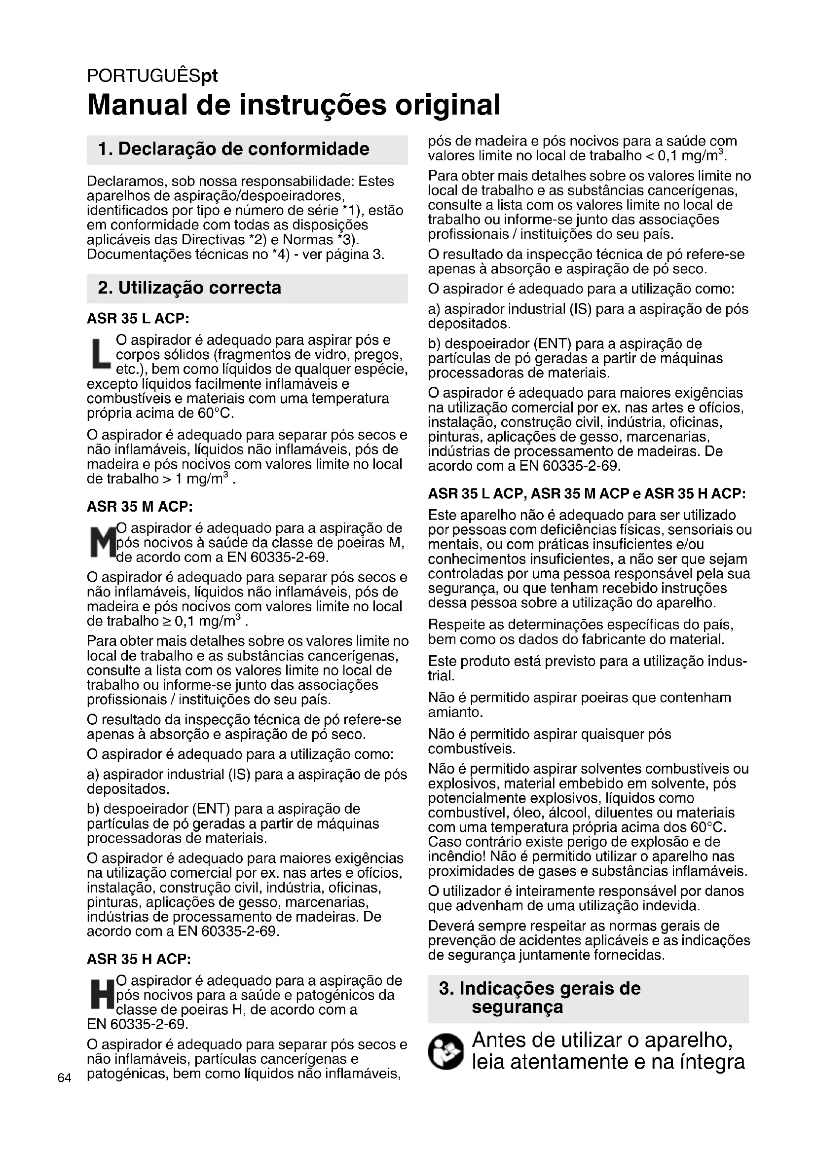 Manual de instruções original Declaramos, sob nossa responsabilidade: Estes aparelhos de aspiração/despoeiradores, identificados por tipo e número de série *1), estão em conformidade com todas as disposições aplicáveis das Directivas *2) e Normas *3). Documentações técnicas no *4) - ver página 3. ASR 35 L ACP: O aspirador é adequado para aspirar pós e corpos sólidos (fragmentos de vidro, pregos, etc.), bem como líquidos de qualquer espécie, excepto líquidos facilmente inflamáveis e combustíveis e materiais com uma temperatura própria acima de 60°C. O aspirador é adequado para separar pós secos e não inflamáveis, líquidos não inflamáveis, pós de madeira e pós nocivos com valores limite no local de trabalho > 1 mg/m³ . ASR 35 M ACP: O aspirador é adequado para a aspiração de pós nocivos à saúde da classe de poeiras M, de acordo com a EN 60335-2-69. O aspirador é adequado para separar pós secos e não inflamáveis, líquidos não inflamáveis, pós de madeira e pós nocivos com valores limite no local de trabalho ≥ 0,1 mg/m³ . Para obter mais detalhes sobre os valores limite no local de trabalho e as substâncias cancerígenas, consulte a lista com os valores limite no local de trabalho ou informe-se junto das associações profissionais / instituições do seu país. O resultado da inspecção técnica de pó refere-se apenas à absorção e aspiração de pó seco. O aspirador é adequado para a utilização como: a) aspirador industrial (IS) para a aspiração de pós depositados. b) despoeirador (ENT) para a aspiração de partículas de pó geradas a partir de máquinas processadoras de materiais. O aspirador é adequado para maiores exigências na utilização comercial por ex. nas artes e ofícios, instalação, construção civil, indústria, oficinas, pinturas, aplicações de gesso, marcenarias, indústrias de processamento de madeiras. De acordo com a EN 60335-2-69. ASR 35 H ACP: O aspirador é adequado para a aspiração de pós nocivos para a saúde e patogénicos da classe de poeiras H, de acordo com a EN 60335-2-69. O aspirador é adequado para separar pós secos e não inflamáveis, partículas cancerígenas e patogénicas, bem como líquidos não inflamáveis, pós de madeira e pós nocivos para a saúde com valores limite no local de trabalho < 0,1 mg/m³. Para obter mais detalhes sobre os valores limite no local de trabalho e as substâncias cancerígenas, consulte a lista com os valores limite no local de trabalho ou informe-se junto das associações profissionais / instituições do seu país. O resultado da inspecção técnica de pó refere-se apenas à absorção e aspiração de pó seco. O aspirador é adequado para a utilização como: a) aspirador industrial (IS) para a aspiração de pós depositados. b) despoeirador (ENT) para a aspiração de partículas de pó geradas a partir de máquinas processadoras de materiais. O aspirador é adequado para maiores exigências na utilização comercial por ex. nas artes e ofícios, instalação, construção civil, indústria, oficinas, pinturas, aplicações de gesso, marcenarias, indústrias de processamento de madeiras. De acordo com a EN 60335-2-69. ASR 35 L ACP, ASR 35 M ACP e ASR 35 H ACP: Este aparelho não é adequado para ser utilizado por pessoas com deficiências físicas, sensoriais ou mentais, ou com práticas insuficientes e/ou conhecimentos insuficientes, a não ser que sejam controladas por uma pessoa responsável pela sua segurança, ou que tenham recebido instruções dessa pessoa sobre a utilização do aparelho. Respeite as determinações específicas do país, bem como os dados do fabricante do material. Este produto está previsto para a utilização indus- trial. Não é permitido aspirar poeiras que contenham amianto. Não é permitido aspirar quaisquer pós combustíveis. Não é permitido aspirar solventes combustíveis ou explosivos, material embebido em solvente, pós potencialmente explosivos, líquidos como combustível, óleo, álcool, diluentes ou materiais com uma temperatura própria acima dos 60°C. Caso contrário existe perigo de explosão e de incêndio! Não é permitido utilizar o aparelho nas proximidades de gases e substâncias inflamáveis. O utilizador é inteiramente responsável por danos que advenham de uma utilização indevida. Deverá sempre respeitar as normas gerais de prevenção de acidentes aplicáveis e as indicações de segurança juntamente fornecidas. Antes de utilizar o aparelho, leia atentamente e na íntegra