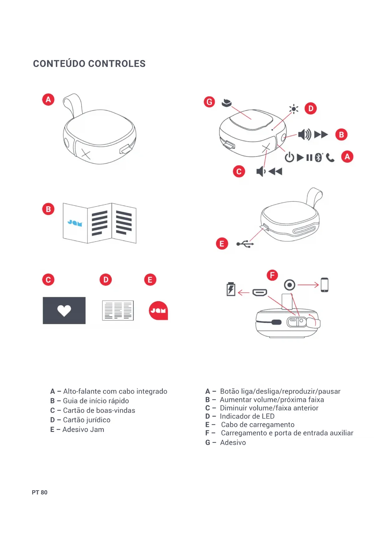 A – Alto-falante com cabo integrado B – Guia de início rápido C – Cartão de boas-vindas D – Cartão jurídico E – Adesivo Jam A – Botão liga/desliga/reproduzir/pausar B – Aumentar volume/próxima faixa C – Diminuir volume/faixa anterior D – Indicador de LED E – Cabo de carregamento F – Carregamento e porta de entrada auxiliar G – AdesivoPT 81 CONFIGURAÇÃO