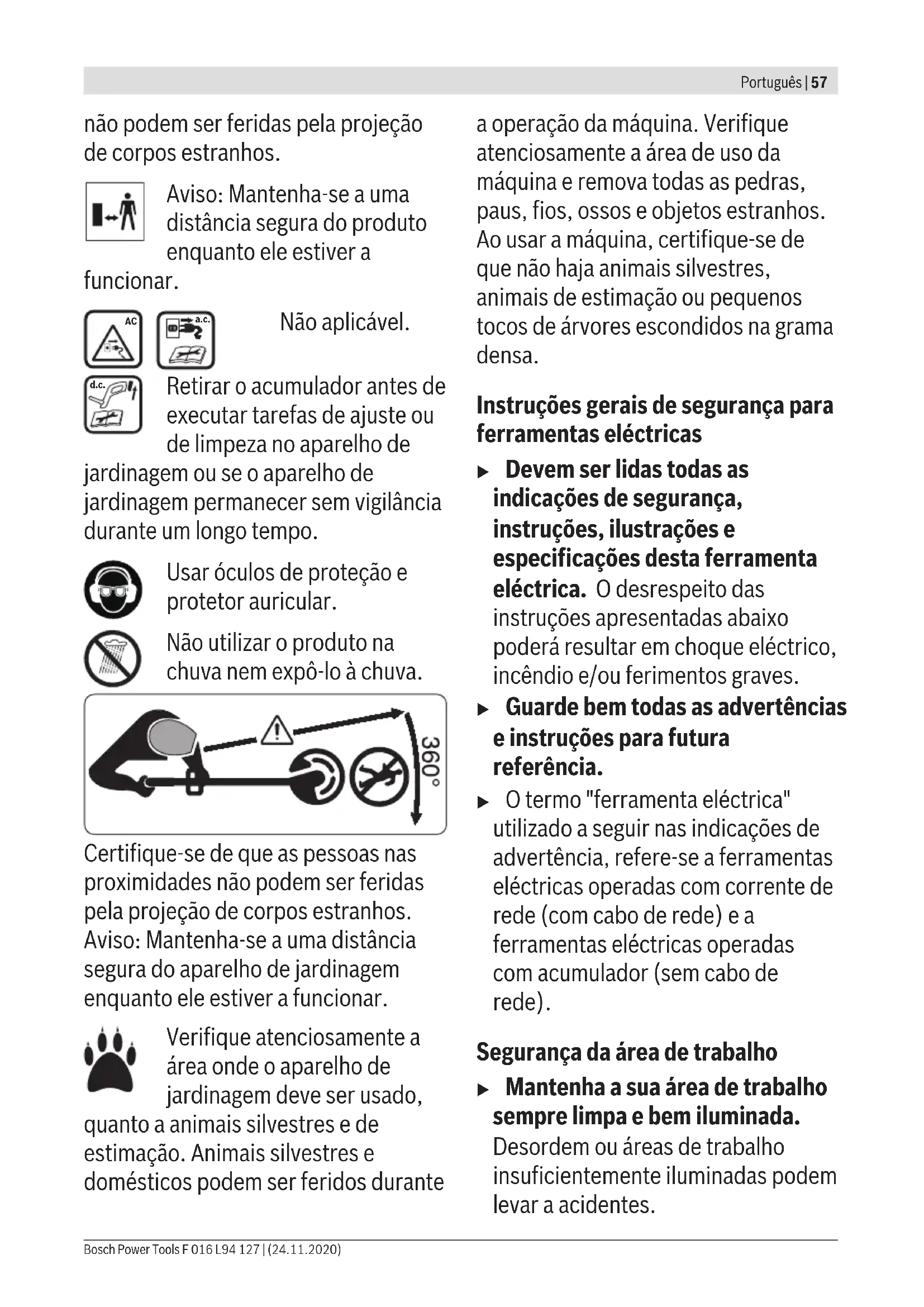 a.c. Não aplicável. d.c. Retirar o acumulador antes de executar tarefas de ajuste ou de limpeza no aparelho de jardinagem ou se o aparelho de jardinagem permanecer sem vigilância durante um longo tempo. Usar óculos de proteção e protetor auricular. Não utilizar o produto na chuva nem expô-lo à chuva. Certifique-se de que as pessoas nas proximidades não podem ser feridas pela projeção de corpos estranhos. Aviso: Mantenha-se a uma distância segura do aparelho de jardinagem enquanto ele estiver a funcionar. Verifique atenciosamente a área onde o aparelho de jardinagem deve ser usado, quanto a animais silvestres e de estimação. Animais silvestres e domésticos podem ser feridos durante a operação da máquina. Verifique atenciosamente a área de uso da máquina e remova todas as pedras, paus, fios, ossos e objetos estranhos. Ao usar a máquina, certifique-se de que não haja animais silvestres, animais de estimação ou pequenos tocos de árvores escondidos na grama densa. Instruções gerais de segurança para ferramentas eléctricas u Devem ser lidas todas as indicações de segurança, instruções, ilustrações e especificações desta ferramenta eléctrica. O desrespeito das instruções apresentadas abaixo poderá resultar em choque eléctrico, incêndio e/ou ferimentos graves. u Guarde bem todas as advertências e instruções para futura referência. u O termo "ferramenta eléctrica" utilizado a seguir nas indicações de advertência, refere‑se a ferramentas eléctricas operadas com corrente de rede (com cabo de rede) e a ferramentas eléctricas operadas com acumulador (sem cabo de rede). Segurança da área de trabalho u Mantenha a sua área de trabalho sempre limpa e bem iluminada. Desordem ou áreas de trabalho insuficientemente iluminadas podem levar a acidentes. Bosch Power Tools F 016 L94 127 | (24.11.2020)58 | Português u Não trabalhar com a ferramenta eléctrica em áreas com risco de explosão, nas quais se encontrem líquidos, gases ou pós inflamáveis. Ferramentas eléctricas produzem faíscas, que podem inflamar pós ou vapores. u Manter crianças e outras pessoas afastadas da ferramenta eléctrica durante a utilização. No caso de distracção é possível que perca o controlo sobre o aparelho. Segurança eléctrica u A ficha de conexão da ferramenta eléctrica deve caber na tomada. A ficha não deve ser modificada de maneira alguma. Não utilizar uma ficha de adaptação junto com ferramentas eléctricas protegidas por ligação à terra. Fichas não modificadas e tomadas apropriadas reduzem o risco de um choque eléctrico. u Evitar que o corpo possa entrar em contacto com superfícies ligadas à terra, como tubos, aquecimentos, fogões e frigoríficos. Há um risco elevado devido a choque eléctrico, se o corpo estiver ligado à terra. u Manter o aparelho afastado de chuva ou humidade. A infiltração de água numa ferramenta eléctrica aumenta o risco de choque eléctrico. u Não deverá utilizar o cabo para outras finalidades. Nunca utilizar o cabo para transportar a ferramenta eléctrica, para pendurá‑la, nem para puxar a ficha da tomada. Manter o cabo afastado do calor, do óleo, de arestas afiadas ou de peças em movimento. Cabos danificados ou emaranhados aumentam o risco de um choque eléctrico. u Se trabalhar com uma ferramenta eléctrica ao ar livre, só deverá utilizar cabos de extensão apropriados para áreas exteriores. A utilização de um cabo de extensão apropriado para áreas exteriores reduz o risco de um choque eléctrico. u Se não for possível evitar o funcionamento da ferramenta eléctrica em áreas húmidas, deverá ser utilizado um disjuntor de corrente de avaria. A utilização de um disjuntor de corrente de avaria reduz o risco de um choque eléctrico. Segurança de pessoas u Esteja atento, observe o que está a fazer e tenha prudência ao trabalhar com a ferramenta eléctrica. Não utilizar uma ferramenta eléctrica quando estiver fatigado ou sob a influência de drogas, álcool ou medicamentos. Um momento de descuido ao utilizar a ferramenta eléctrica, pode levar a lesões graves. F 016 L94 127 | (24.11.2020) Bosch Power ToolsPortuguês | 59 u Utilizar equipamento de protecção individual. Utilizar sempre óculos de protecção. A utilização de equipamento de protecção pessoal, como máscara de protecção contra pó, sapatos de segurança antiderrapantes, capacete de segurança ou protecção auricular, de acordo com o tipo e aplicação da ferramenta eléctrica, reduz o risco de lesões. u Evitar uma colocação em funcionamento involuntária. Assegure‑se de que a ferramenta eléctrica esteja desligada, antes de conectá‑la à alimentação de rede e/ou ao acumulador, antes de levantá‑la ou de transportá‑la. Se tiver o dedo no interruptor ao transportar a ferramenta eléctrica ou se o aparelho for conectado à alimentação de rede enquanto estiver ligado, poderão ocorrer acidentes. u Remover ferramentas de ajuste ou chaves de boca antes de ligar a ferramenta eléctrica. Uma ferramenta ou chave que se encontre numa parte do aparelho em movimento pode levar a lesões. u Evite uma posição anormal. Mantenha uma posição firme e mantenha sempre o equilíbrio. Desta forma é mais fácil controlar a ferramenta eléctrica em situações inesperadas. u Usar roupa apropriada. Não usar roupa larga nem jóias. Mantenha os cabelos e roupas afastados de peças em movimento. Roupas frouxas, cabelos longos ou jóias podem ser agarrados por peças em movimento. u Se for possível montar dispositivos de aspiração ou de recolha, assegure‑se de que estejam conectados e utilizados correctamente. A utilização de uma aspiração de pó pode reduzir o perigo devido ao pó. u Não deixe que a familiaridade resultante de uma utilização frequente de ferramentas permita que você se torne complacente e ignore os princípios de segurança da ferramenta. Uma acção descuidada pode causar ferimentos graves n