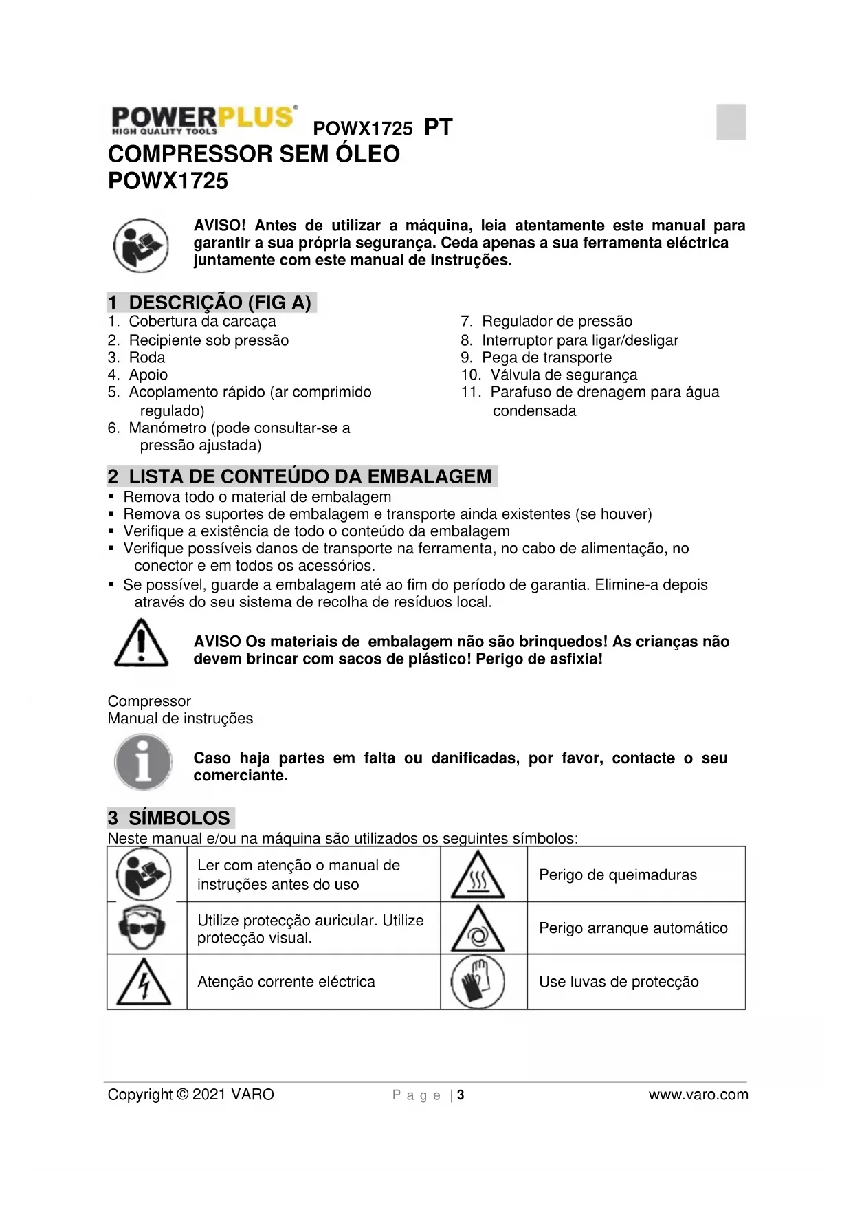 Copyright © 2021 VARO P a g e | 10 www.varo.com 12 GARANTIA Este produto tem uma garantia de um período de 36 meses efectivos, a partir da data de aquisição pelo primeiro utilizador. Esta garantia cobre todas as falhas do material ou produção, mas não inclui: baterias, carregadores, peças com defeito por desgaste de utilização normal, como suportes, escovas, cabos e tomadas ou acessórios como brocas, lâminas de serra, etc., danos ou defeitos que sejam resultado de utilização indevida, acidentes ou alterações, nem os custos de transporte. Danos e/ou defeitos resultantes de utilização inadequada também não estão cobertos pelas condições de garantia. Renunciamos também qualquer responsabilidade por quaisquer ferimentos corporais resultantes de utilização inadequada da ferramenta. As reparações apenas devem ser levadas a cabo por um centro de serviço ao cliente autorizado para ferramentas Powerplus. A qualquer momento pode obter mais informação através do número 00 32 3 292 92 90. Quaisquer custos de transporte devem sempre ser imputados ao cliente, excepto se acordado de outra forma por escrito. Ao mesmo tempo, não pode ser entregue qualquer reivindicação de garantia, se o dano do aparelho resulta de uma manutenção negligente ou de uma sobrecarga. Uma exclusão definitiva da garantia resulta de danos causados por permeação de líquidos, penetração excessiva de poeira, danificação intencional (deliberadamente ou devido à grave falta de cuidados), uso não apropriado (utilização para fins não adequados para este aparelho), utilização não qualificada (p.ex. não respeitando as instruções dadas neste manual), montagem incorrecta, queda de raio, voltagem de rede incorrecta. Esta lista não é restrictiva. Nunca a aceitação de reivindicações de garantia pode levar à prolongamento da garantia ou ao início de um novo período de garantia em caso da substituição do aparelho. Por isso, aparelhos ou componentes substituídos sob garantia ficam na posse de Varo NV. Nós reservamos o direito de rejeitar qualquer reivindicação onde a aquisição não possa ser verificada ou quando é visível que o produto não foi utilizado correctamente. (Limpeza das ranhuras de ventilação, escovas de carvão utilizadas com regularidade, ...) Deverá guardar o seu talão de compra como prova de aquisição do produto. A sua ferramenta desmontada deverá ser devolvida ao representante num estado de limpeza aceitável, na sua caixa de transporte original (aplicável às unidades acompanhadas da prova de compra). 13 MEIO-AMBIENTE Se a sua máquina necessitar de ser substituída após uma utilização prolongada, não a coloque no lixo doméstico. Elimine-a de uma forma ecologicamente segura. O lixo produzido pelas máquinas eléctricas não pode ser eliminado com o lixo doméstico normal. Faça a reciclagem onde existam instalações adequadas. Consulte as autoridades locais ou o seu revendedor para conselhos sobre a recolha e a eliminação.POWX1725 SV Copyright © 2021 VARO P a g e | 1 www.varo.com