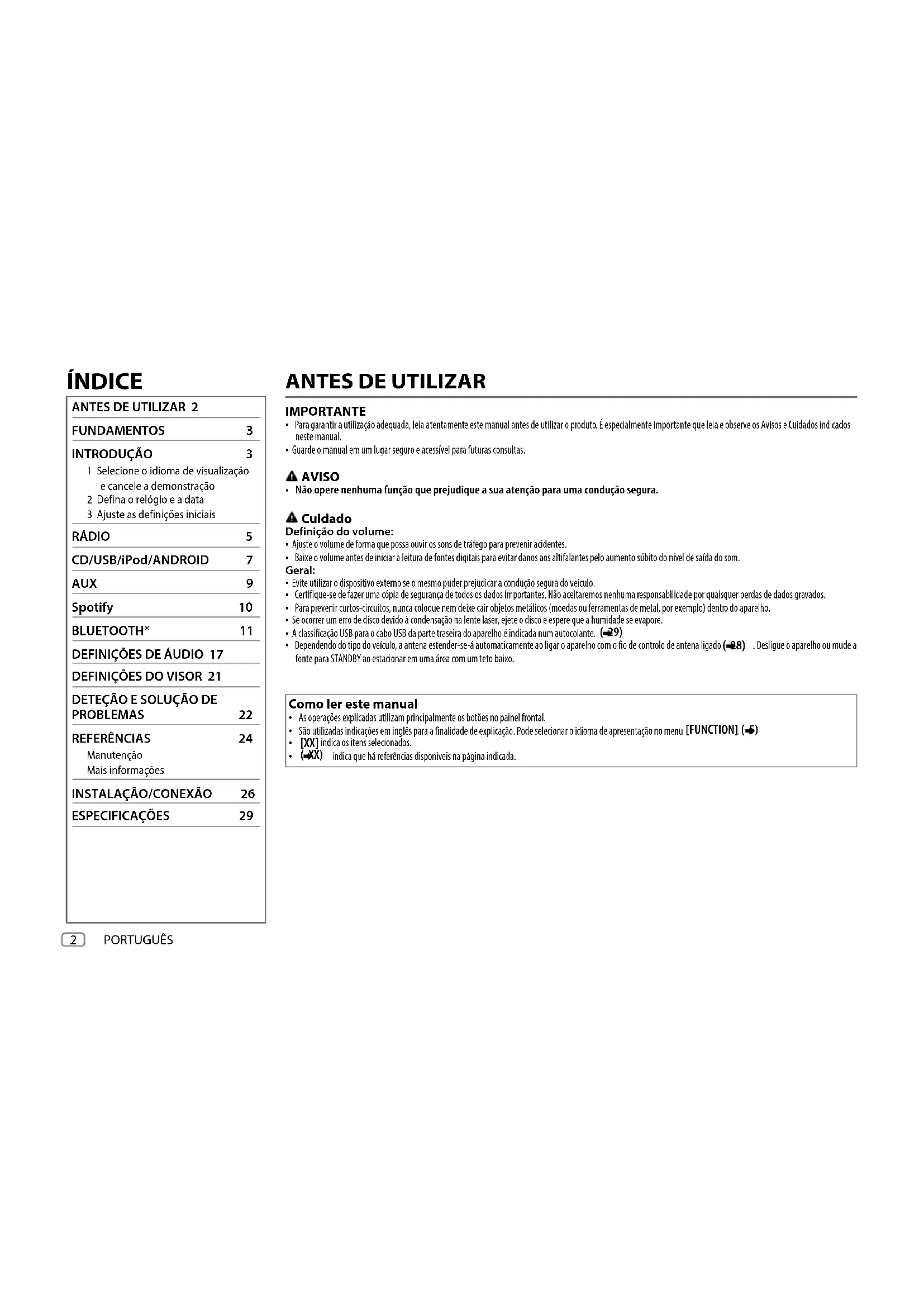 FUNDAMENTOS 3 INTRODUÇÃO 3 1 Selecione o idioma de visualização e cancele a demonstração 2 Defina o relógio e a data 3 Ajuste as definições iniciais RÁDIO 5 CD/USB/iPod/ANDROID 7 AUX 9 Spotify 10 BLUETOOTH® 11