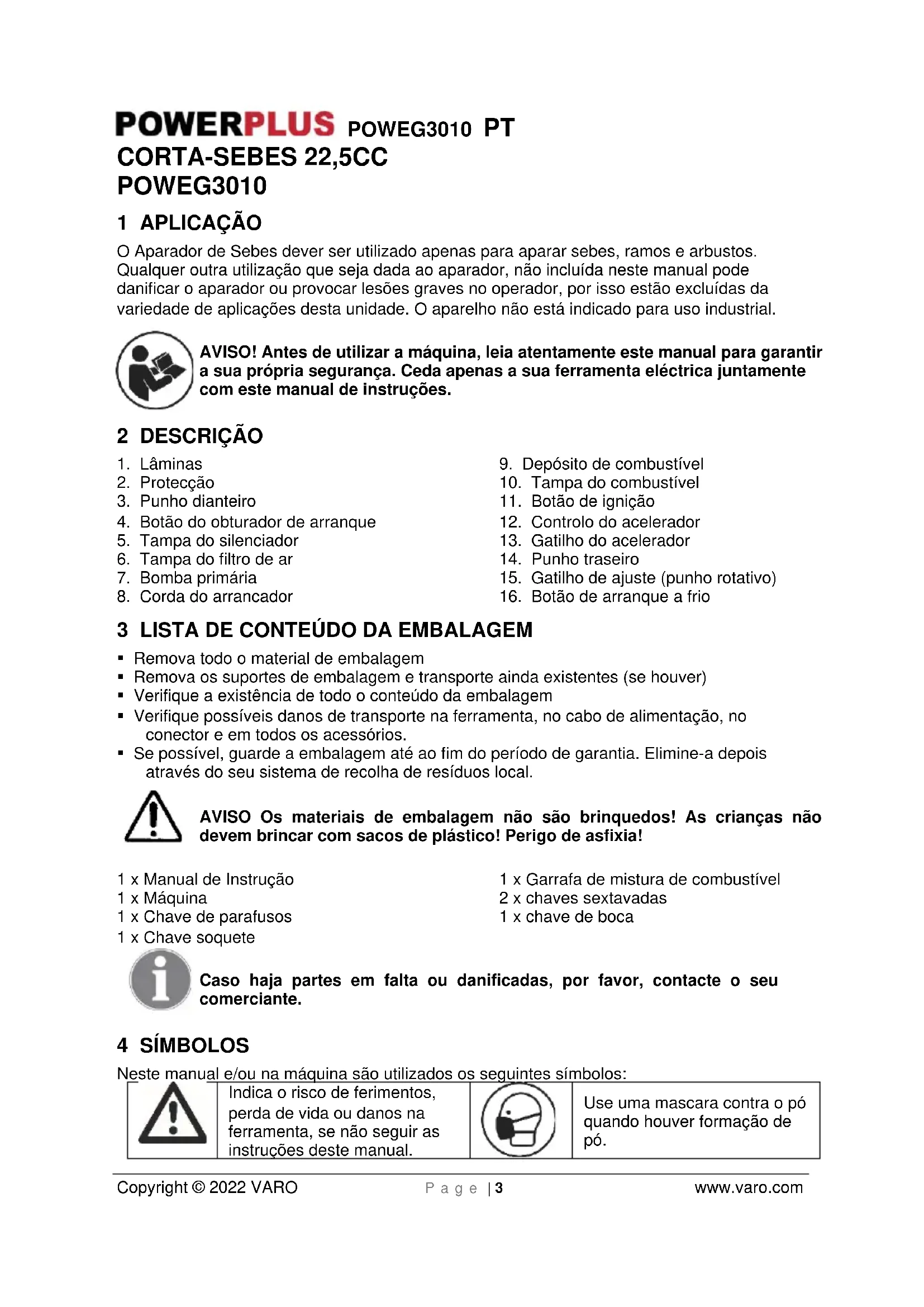 Copyright © 2022 VARO P a g e | 3 www.varo.com CORTA-SEBES 22,5CC POWEG3010 1 APLICAÇÃO O Aparador de Sebes dever ser utilizado apenas para aparar sebes, ramos e arbustos. Qualquer outra utilização que seja dada ao aparador, não incluída neste manual pode danificar o aparador ou provocar lesões graves no operador, por isso estão excluídas da variedade de aplicações desta unidade. O aparelho não está indicado para uso industrial. AVISO! Antes de utilizar a máquina, leia atentamente este manual para garantir a sua própria segurança. Ceda apenas a sua ferramenta eléctrica juntamente com este manual de instruções. 2 DESCRIÇÃO
