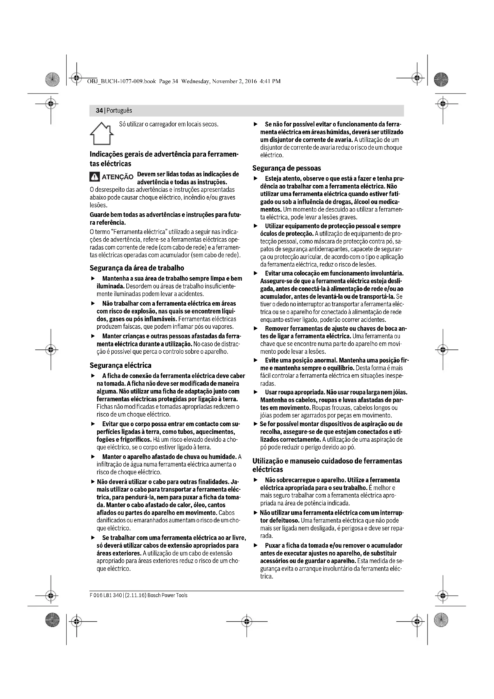 0,088 (EU) 0,093 (UK) 0,085 (AU) 0,088 (EU) 0,093 (UK) 0,085 (AU) 0,088 (EU) 0,093 (UK) 0,085 (AU) 0,088 (EU) 0,093 (UK) 0,085 (AU) Observar o número de produto na placa de características do seu aparelho de jardinagem. A designação comercial dos aparelhos de jardinagem indi- viduais pode variar. **autonomia média ***só no conjunto “ASB 10,8 LI Set” OBJ_BUCH-1077-009.book Page 38 Wednesday, November 2, 2016 4:41 PMPortuguês | 39 Bosch Power Tools F 016 L81 340 | (2.11.16) ferramentas eléctricas. Ele também é apropriado para uma avaliação provisória da carga de vibrações. O nível de vibrações indicado representa as aplicações princi- pais da ferramenta eléctrica. Se, contudo, a ferramenta eléc- trica for utilizada para outras aplicações, com acessórios dife- rentes, com outras ferramentas de trabalho ou com manutenção insuficiente, é possível que o nível de vibrações seja diferente. Isto pode aumentar sensivelmente a carga de vibrações para o período completo de trabalho. Para uma estimação exacta da carga de vibrações, também deveriam ser considerados os períodos nos quais o aparelho está desligado ou funciona, mas não está sendo utilizado. Isto pode reduzir a carga de vibrações durante o completo perío- do de trabalho. Além disso também deverão ser estipuladas medidas de se- gurança para proteger o operador contra o efeito de vibra- ções, como por exemplo: manutenção de ferramentas eléctri- cas e de ferramentas de trabalho, manter as mãos quentes e organização dos processos de trabalho. Declaração de conformidade Tesoura de relva Declaramos sob nossa inteira responsabilidade que o pro- duto descrito nos “Dados técnicos” está em conformidade com todas as disposições pertinentes das Directivas 2014/35/EU, 2011/65/UE, até 19 de Abril de 2016: 2004/108/CE, a partir de 20 de Abril de 2016: 2014/30/UE, 2006/42/CE incluindo suas alterações, e em conformidade com as seguintes normas: EN 60335-1, EN 50636-2-94 (ferramenta sem fio), EN 50581, EN 60335-1, EN 60335-2-29 (carregador). Corta-sebes Declaramos sob nossa inteira responsabilidade que o pro- duto descrito nos “Dados técnicos” está em conformidade com todas as disposições pertinentes das Directivas 2014/35/EU, 2011/65/UE, até 19 de Abril de 2016: 2004/108/CE, a partir de 20 de Abril de 2016: 2014/30/UE, 2006/42/CE, 2000/14/CE incluindo suas alterações, e em conformidade com as seguintes normas: EN 60745-1, EN 60745-2-15 (ferramenta sem fio), EN 50581, EN 60335-1, EN 60335-2-29 (carregador). 2000/14/CE: Nível de potência acústica garantido 77 dB(A). Processo de avaliação da conformidade conforme anexo V. Categoria de produto: 25 Processo técnico (2006/42/CE, 2000/14/CE) em: Bosch Lawn and Garden Ltd., PT-HG/ENS-PA2, Stowmarket, Suffolk IP14 1EY, England Robert Bosch Power Tools GmbH 70538 Stuttgart, GERMANY Stuttgart, 01.01.2017 Montagem de funcionamento Cortar sebes Antes de iniciar o trabalho, deverá verificar se na sebe se en- contram corpos estranhos, como p. ex. cercas de jardim. Utilização Segurar o aparelho de jardinagem, corretamente, pelo pu- nho, para não perder o controlo. O manuseio incorreto pode levar a lesões. Depois da utilização deverá cobrir a lâmina de corte com a protecção para transporte. Cabo telescópico Utilizar o cabo telescópico com o acessório para corte da rel- va e de arbustos. Antes de usar o punho com o acessório para cortar arbustos é necessário remover as rodas. Mecanismo anti-bloqueio Se a lâmina de corte for bloqueada em material resistente, a carga do motor aumenta. A microelectrónica inteligente reco- nhece a situação de sobrecarga e repete várias vêzes a comu- tação do motor, para evitar o bloqueio das lâminas de corte e para cortar o material. Esta audível comutação pode demorar até 3 s. Depois de cortar, o aparelho de jardim continua a trabalhar no estado normal ou, em caso de uma persistente situação de so- brecarga, a lâmina de corte permanece aberta (p. ex. se um pedaço de uma cerca metálica bloquear por acidente o apare- lho de jardim. Indicação do estado de carga do acu- mulador A indicação do estado de carga do acumulador indica o pro- gresso de carga. Durante o processo de carga a indicação pis- ca verde. Se a indicação do estado de carga do acumulador estiver permanentemente ligada, significa que o acumula- dor está completamente carregado. Henk Becker Executive Vice President Engineering Helmut Heinzelmann Head of Product Certification PT/ECS Meta de ação Figura Página Volume de fornecimento