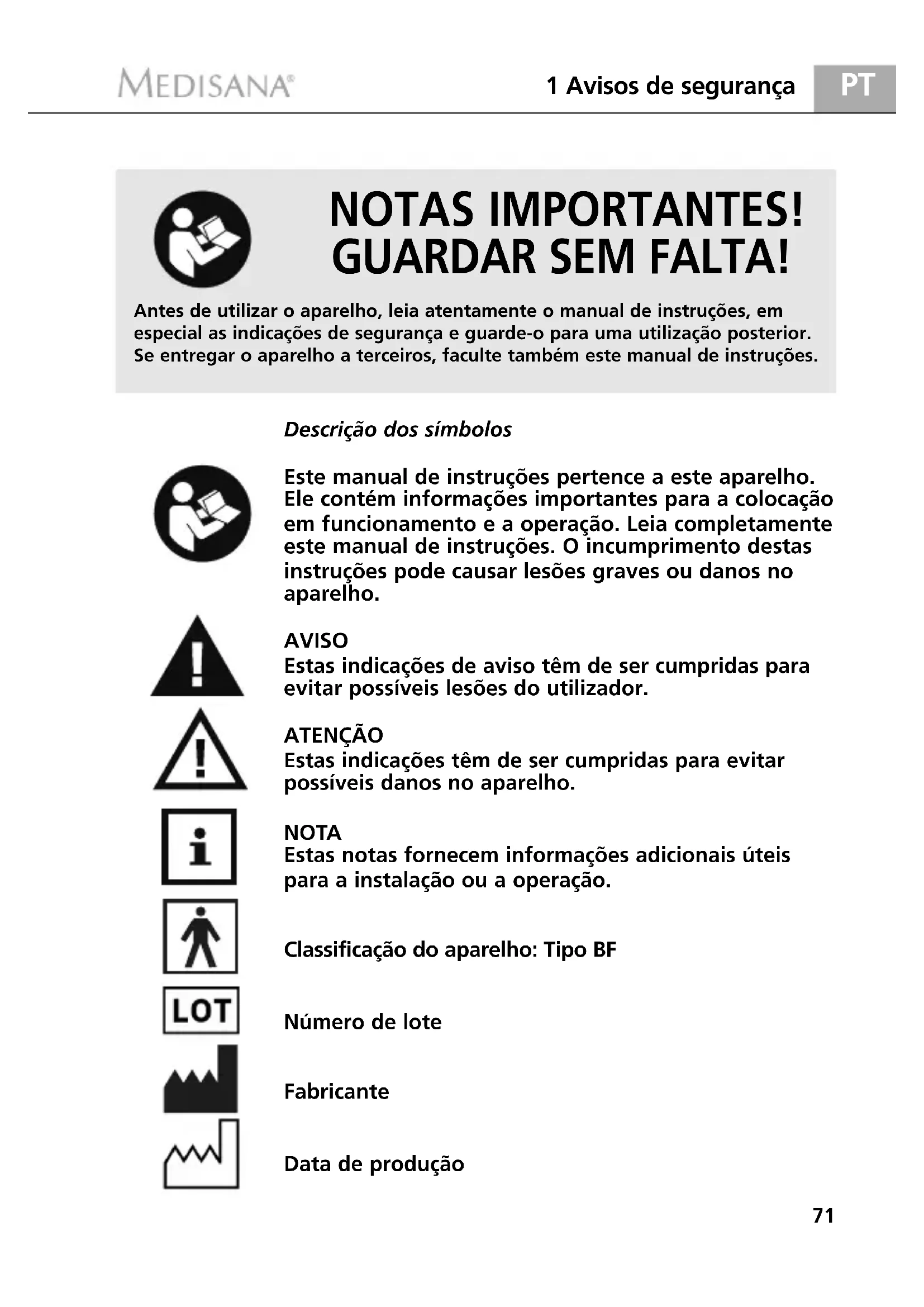 NOTAS IMPORTANTES! GUARDAR SEM FALTA! Descrição dos símbolos Este manual de instruções pertence a este aparelho. Ele contém informações importantes para a colocação em funcionamento e a operação. Leia completamente este manual de instruções. O incumprimento destas instruções pode causar lesões graves ou danos no aparelho. AVISO Estas indicações de aviso têm de ser cumpridas para evitar possíveis lesões do utilizador. ATENÇÃO Estas indicações têm de ser cumpridas para evitar possíveis danos no aparelho. NOTA Estas notas fornecem informações adicionais úteis para a instalação ou a operação. Classificação do aparelho: Tipo BF Número de lote Fabricante Data de produção Antes de utilizar o aparelho, leia atentamente o manual de instruções, em especial as indicações de segurança e guarde-o para uma utilização posterior.Se entregar o aparelho a terceiros, faculte também este manual de instruções.MTP_Pro_51090_3MAM_West_21082017_Blutdruckmessgerät 21.08.17 07:36 Seite 711.2 O que deverá fazer sem falta