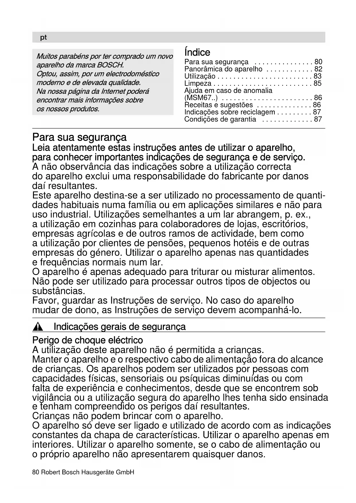- Nos reservamos el derecho de introducir modificaciones.80 Robert Bosch Hausgeräte GmbH Índice Para sua segurança p. 80