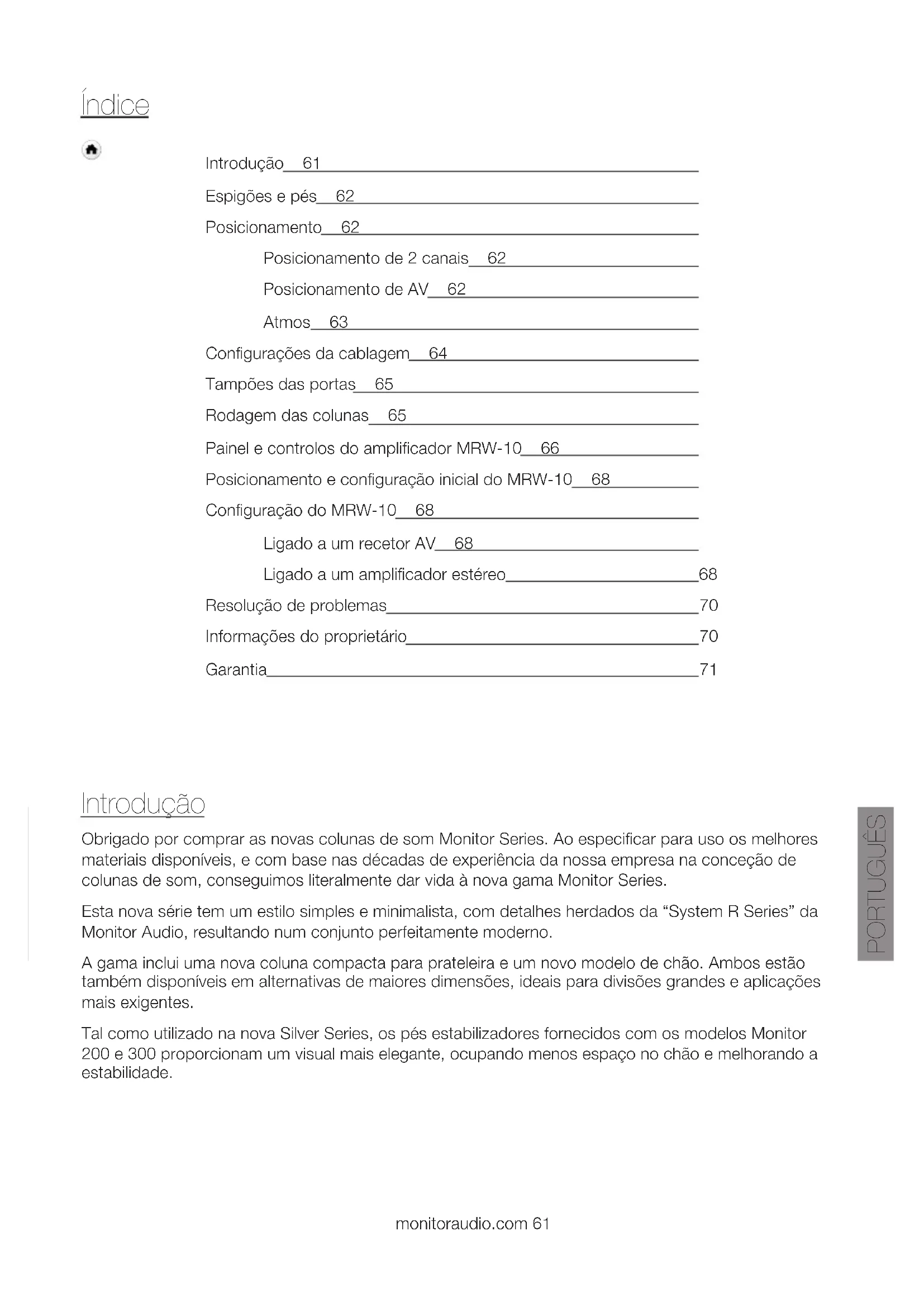 Correo electrónico ..................................................................................................................... Número de teléfono ...................................................................................................................ESPAÑOL monitoraudio.com 59 Garantía Tanto la mano de obra como el funcionamiento del producto están garantizados respecto a defectos de fabricación durante cinco años a partir de la fecha de compra (consulte las condiciones en el manual Instrucciones importantes de seguridad), siempre que el producto fuera suministrado por un distribuidor autorizado de Monitor Audio conforme al contrato de venta para cliente final. Para ayudarnos a encontrar la información de su garantía en nuestra base de datos de clientes —en caso de que resulte necesario—, dedique unos minutos a registrar sus productos en el siguiente sitio web: monitoraudio.com.MONITOR SERIES manual do utilizadorPORTUGUÊS monitoraudio.com 61 Introdução 61 Espigões e pés 62 Posicionamento 62 Posicionamento de 2 canais 62 Posicionamento de AV 62 Atmos 63 Configurações da cablagem 64 Tampões das portas 65 Rodagem das colunas 65 Painel e controlos do amplificador MRW-10 66 Posicionamento e configuração inicial do MRW-10 68 Configuração do MRW-10 68 Ligado a um recetor AV 68 Ligado a um amplificador estéreo 68 Resolução de problemas 70 Informações do proprietário 70 Garantia 71 Índice Introdução Obrigado por comprar as novas colunas de som Monitor Series. Ao especificar para uso os melhores materiais disponíveis, e com base nas décadas de experiência da nossa empresa na conceção de colunas de som, conseguimos literalmente dar vida à nova gama Monitor Series. Esta nova série tem um estilo simples e minimalista, com detalhes herdados da “System R Series” da Monitor Audio, resultando num conjunto perfeitamente moderno. A gama inclui uma nova coluna compacta para prateleira e um novo modelo de chão. Ambos estão também disponíveis em alternativas de maiores dimensões, ideais para divisões grandes e aplicações mais exigentes. Tal como utilizado na nova Silver Series, os pés estabilizadores fornecidos com os modelos Monitor 200 e 300 proporcionam um visual mais elegante, ocupando menos espaço no chão e melhorando a estabilidade.Monitor Series62 Espigões e pés (Apenas Monitor 200 e 300) Se a coluna estiver a ser instalada em pavimento alcatifado, aparafuse o espigão ao pé estabilizador. Fixe o conjunto à base da coluna utilizando os parafusos fornecidos (A e B). Pode verificar se a coluna está nivelada em todos os lados utilizando o nível de bolha. Se estiver ligeiramente desnivelada, desaparafuse o pé no ponto mais baixo e verifique novamente. Continue este processo até que a caixa esteja completamente nivelada. Utilize as porcas de bloqueio em cada pé para fixá-lo no sítio e evitar quaisquer vibrações indesejáveis. Certifique-se de que não há fios escondidos por baixo da alcatifa que possam ser danificados pelos espigões. Se não utilizar os espigões, posicione os pés de borracha autocolantes incluídos na parte inferior do estabilizador. Posicionamento Posicionamento de 2 canais Ao configurar um sistema de 2 canais, a posição de audição e as colunas devem formar um triângulo equilátero. As colunas devem ser posicionados a uma distância de 1,8 m a 3 m entre si. A distância ideal à parede posterior varia consoante a coluna e o gosto pessoal. No entanto, as colunas necessitam de estar a uma distância mínima de 91 cm das paredes laterais. Recomendamos vivamente que experimente vários posicionamentos quando configurar inicialmente as colunas, pois o ambiente e a preferência pessoal diferem em cada a instalação. Se não houver graves suficientes, por exemplo, tente aproximar as colunas de uma parede. A abordagem oposta é recomendada se houver um excesso de graves. Em alternativa, se isto não for possível, os tampões das portas fornecidos podem ajudar a reduzir o excesso de graves. Se estiver a perder o efeito estéreo, experimente "incliná-las" ligeiramente. O som deve parecer que provém do ponto central entre as colunas, não das próprias colunas. Posicionamento de AV Consulte as ilustrações seguintes para os ângulos e posições ideais de cada coluna no seu sistema de surround. As colunas devem estar distanciadas da parede de acordo com a coluna e a preferência pessoal. Se o som possuir demasiados graves ou houver um "boom" dos graves vindo da divisão ao reproduzir música (sem um subwoofer), experimente afastar as colunas da(s) parede(s). Se tal não for possível, experimente ajustar as definições da frequência de crossover das colunas e/ou do subwoofer, ou alterar a posição do subwoofer. A coluna central Monitor C150 deve ser posicionada de modo que o tweeter aponte para a posição de visualização, aproximadamente à altura do ouvido. Espigão (A) (B) Porca de bloqueio inferior Pé estabilizador Porca de bloqueio superior Tampa superiorPORTUGUÊS monitoraudio.com 63