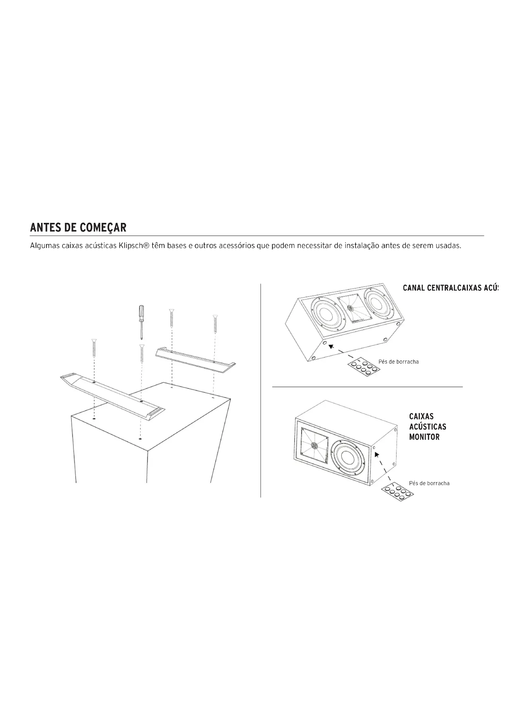 Algumas caixas acústicas Klipsch® têm bases e outros acessórios que podem necessitar de instalação antes de serem usadas.