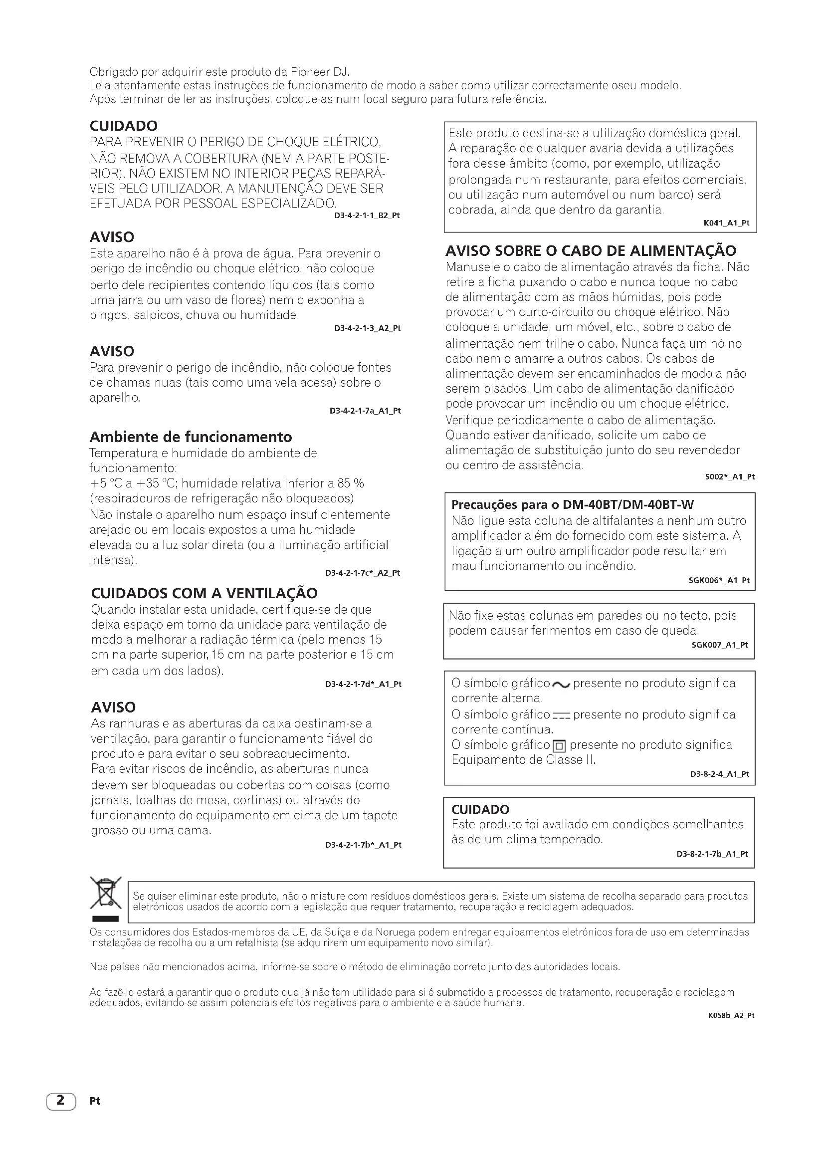 Quando instalar esta unidade, certifique-se de que deixa espaço em torno da unidade para ventilação de modo a melhorar a radiação térmica (pelo menos 15 cm na parte superior, 15 cm na parte posterior e 15 cm em cada um dos lados). D3-4-2-1-7d*_A1_Pt Este produto destina-se a utilização doméstica geral. A reparação de qualquer avaria devida a utilizações fora desse âmbito (como, por exemplo, utilização prolongada num restaurante, para efeitos comerciais, ou utilização num automóvel ou num barco) será cobrada, ainda que dentro da garantia. K041_A1_Pt Os consumidores dos Estados-membros da UE, da Suíça e da Noruega podem entregar equipamentos eletrónicos fora de uso em determinadas instalações de recolha ou a um retalhista (se adquirirem um equipamento novo similar). Nos países não mencionados acima, informe-se sobre o método de eliminação correto junto das autoridades locais. Ao fazê-lo estará a garantir que o produto que já não tem utilidade para si é submetido a processos de tratamento, recuperação e reciclagem adequados, evitando-se assim potenciais efeitos negativos para o ambiente e a saúde humana. K058b_A2_Pt Se quiser eliminar este produto, não o misture com resíduos domésticos gerais. Existe um sistema de recolha separado para produtos eletrónicos usados de acordo com a legislação que requer tratamento, recuperação e reciclagem adequados. AVISO SOBRE O CABO DE ALIMENTAÇÃO Manuseie o cabo de alimentação através da ficha. Não retire a ficha puxando o cabo e nunca toque no cabo de alimentação com as mãos húmidas, pois pode provocar um curto-circuito ou choque elétrico. Não coloque a unidade, um móvel, etc., sobre o cabo de alimentação nem trilhe o cabo. Nunca faça um nó no cabo nem o amarre a outros cabos. Os cabos de alimentação devem ser encaminhados de modo a não serem pisados. Um cabo de alimentação danificado pode provocar um incêndio ou um choque elétrico. Verifique periodicamente o cabo de alimentação. Quando estiver danificado, solicite um cabo de alimentação de substituição junto do seu revendedor ou centro de assistência. S002*_A1_Pt Precauções para o DM-40BT/DM-40BT-W Não ligue esta coluna de altifalantes a nenhum outro amplificador além do fornecido com este sistema. A ligação a um outro amplificador pode resultar em mau funcionamento ou incêndio. SGK006*_A1_Pt Não fixe estas colunas em paredes ou no tecto, pois podem causar ferimentos em caso de queda. SGK007_A1_Pt AVISO As ranhuras e as aberturas da caixa destinam-se a ventilação, para garantir o funcionamento fiável do produto e para evitar o seu sobreaquecimento. Para evitar riscos de incêndio, as aberturas nunca devem ser bloqueadas ou cobertas com coisas (como jornais, toalhas de mesa, cortinas) ou através do funcionamento do equipamento em cima de um tapete grosso ou uma cama. D3-4-2-1-7b*_A1_Pt O símbolo gráfico presente no produto significa corrente alterna. O símbolo gráfico presente no produto significa corrente contínua. O símbolo gráfico presente no produto significa Equipamento de Classe II. D3-8-2-4_A1_Pt CUIDADO Este produto foi avaliado em condições semelhantes às de um clima temperado. D3-8-2-1-7b_A1_PtPt