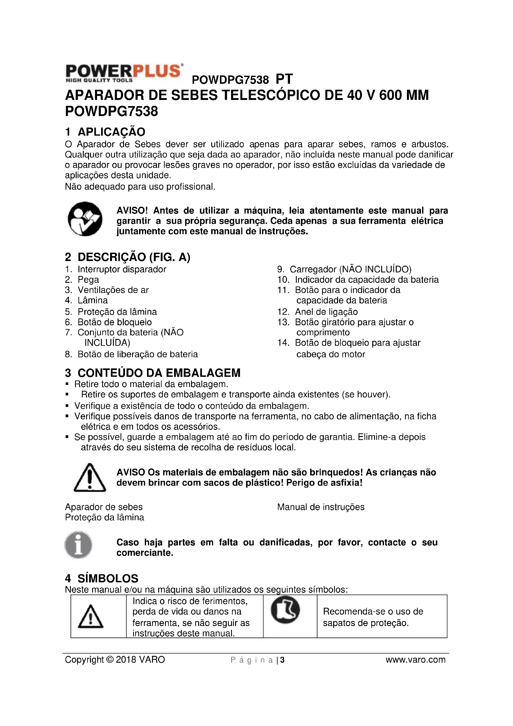 Copyright © 2018 VARO P á g i n a | 3 www.varo.com APARADOR DE SEBES TELESCÓPICO DE 40 V 600 MM POWDPG7538 1 APLICAÇÃO O Aparador de Sebes dever ser utilizado apenas para aparar sebes, ramos e arbustos. Qualquer outra utilização que seja dada ao aparador, não incluída neste manual pode danificar o aparador ou provocar lesões graves no operador, por isso estão excluídas da variedade de aplicações desta unidade. Não adequado para uso profissional. AVISO! Antes de utilizar a máquina, leia atentamente este manual para garantir a sua própria segurança. Ceda apenas a sua ferramenta elétrica juntamente com este manual de instruções. 2 DESCRIÇÃO (FIG. A)