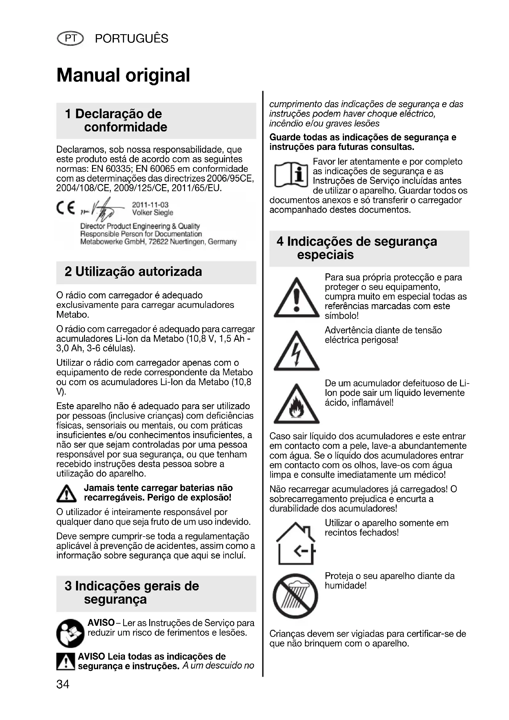 Declaramos, sob nossa responsabilidade, que este produto está de acordo com as seguintes normas: EN 60335; EN 60065 em conformidade com as determinações das directrizes 2006/95CE, 2004/108/CE, 2009/125/CE, 2011/65/EU. O rádio com carregador é adequado exclusivamente para carregar acumuladores Metabo. O rádio com carregador é adequado para carregar acumuladores Li-Ion da Metabo (10,8 V, 1,5 Ah - 3,0 Ah, 3-6 células). Utilizar o rádio com carregador apenas com o equipamento de rede correspondente da Metabo ou com os acumuladores Li-Ion da Metabo (10,8 V). Este aparelho não é adequado para ser utilizado por pessoas (inclusive crianças) com deficiências físicas, sensoriais ou mentais, ou com práticas insuficientes e/ou conhecimentos insuficientes, a não ser que sejam controladas por uma pessoa responsável por sua segurança, ou que tenham recebido instruções desta pessoa sobre a utilização do aparelho. Jamais tente carregar baterias não recarregáveis. Perigo de explosão! O utilizador é inteiramente responsável por qualquer dano que seja fruto de um uso indevido. Deve sempre cumprir-se toda a regulamentação aplicável à prevenção de acidentes, assim como a informação sobre segurança que aqui se incluí. AVISO – Ler as Instruções de Serviço para reduzir um risco de ferimentos e lesões. AVISO Leia todas as indicações de segurança e instruções. A um descuido no cumprimento das indicações de segurança e das instruções podem haver choque eléctrico, incêndio e/ou graves lesões Guarde todas as indicações de segurança e instruções para futuras consultas. Favor ler atentamente e por completo as indicações de segurança e as Instruções de Serviço incluídas antes de utilizar o aparelho. Guardar todos os documentos anexos e só transferir o carregador acompanhado destes documentos. Para sua própria protecção e para proteger o seu equipamento, cumpra muito em especial todas as referências marcadas com este símbolo! Advertência diante de tensão eléctrica perigosa! De um acumulador defeituoso de Li- Ion pode sair um líquido levemente ácido, inflamável! Caso sair líquido dos acumuladores e este entrar em contacto com a pele, lave-a abundantemente com água. Se o líquido dos acumuladores entrar em contacto com os olhos, lave-os com água limpa e consulte imediatamente um médico! Não recarregar acumuladores já carregados! O sobrecarregamento prejudica e encurta a durabilidade dos acumuladores! Utilizar o aparelho somente em recintos fechados! Proteja o seu aparelho diante da humidade! Crianças devem ser vigiadas para certificar-se de que não brinquem com o aparelho. Manual original 1 Declaração de conformidade 2 Utilização autorizada 3 Indicações gerais de segurança 4 Indicações de segurança especiaisPORTUGUÊS