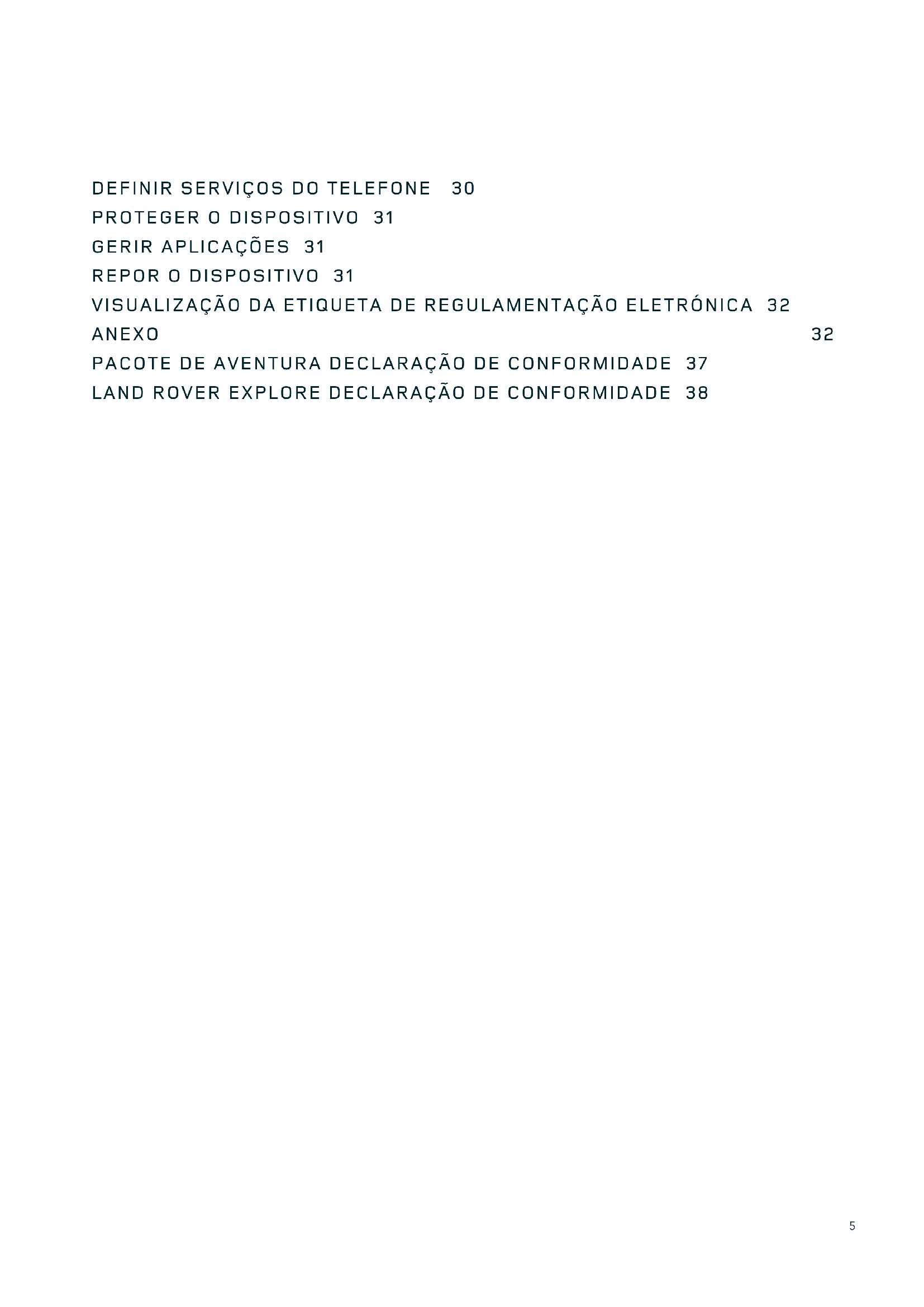VISUALIZAÇÃO DA ETIQUETA DE REGULAMENTAÇÃO ELETRÓNICA 32 ANEXO 32 PACOTE DE AVENTURA DECLARAÇÃO DE CONFORMIDADE 37 LAND ROVER EXPLORE DECLARAÇÃO DE CONFORMIDADE 386 BEM-VINDO AO LAND ROVER EXPLORE: