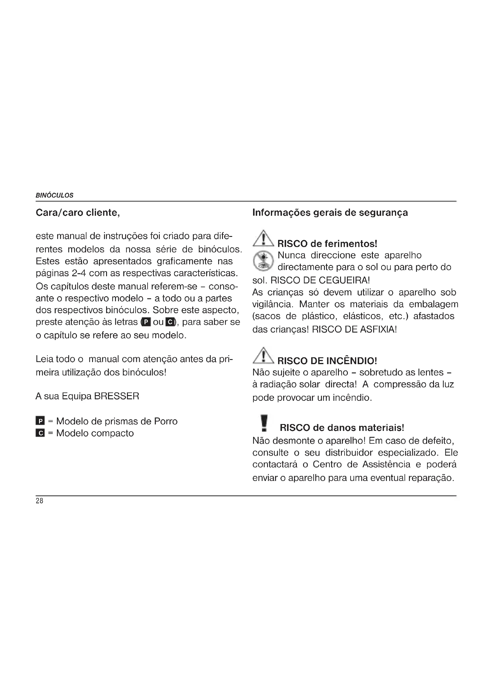 ), para saber se o capítulo se refere ao seu modelo. Leia todo o manual com atenção antes da pri- meira utilização dos binóculos! A sua Equipa BRESSER