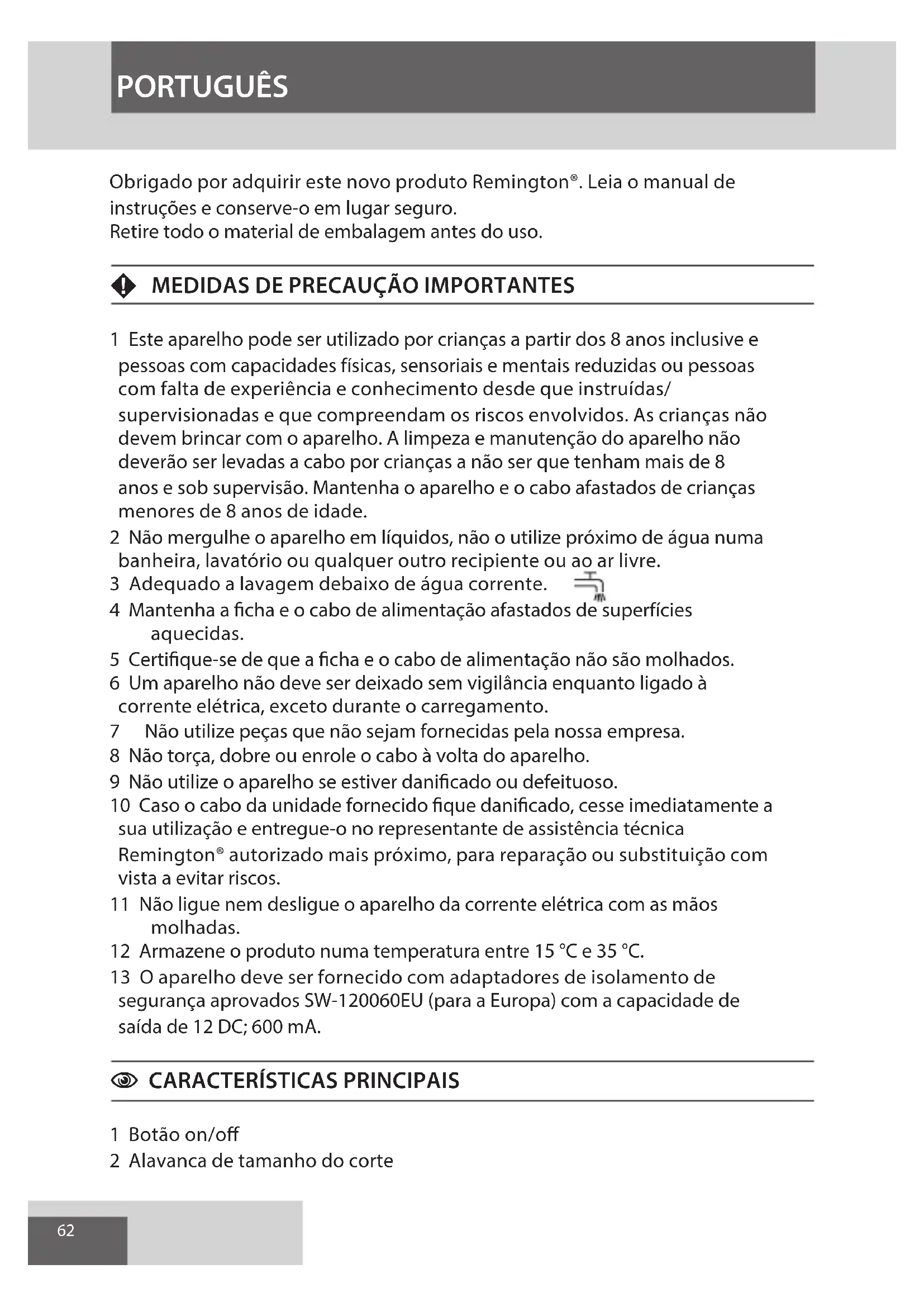 Obrigado por adquirir este novo produto Remington®. Leia o manual de instruções e conserve-o em lugar seguro.