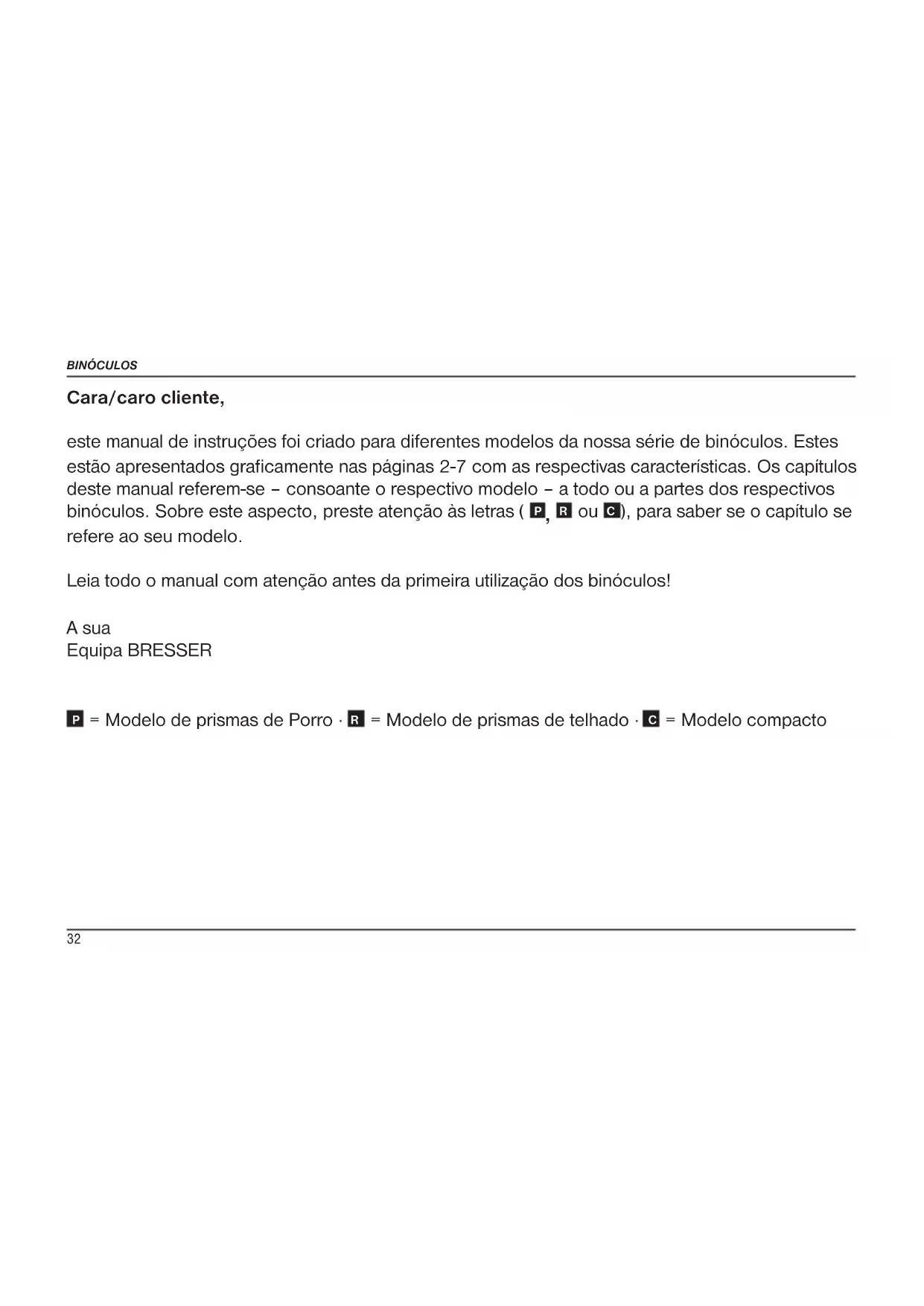), para saber se o capítulo se refere ao seu modelo. Leia todo o manual com atenção antes da primeira utilização dos binóculos! A sua Equipa BRESSER