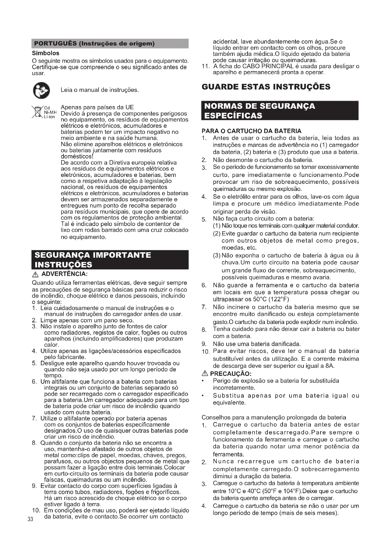 Antes de usar o cartucho da bateria, leia todas as instruções e marcas de advertência no (1) carregador da bateria, (2) bateria e (3) produto que usa a bateria. Não desmonte o cartucho da bateria. Se o período de funcionamento se tornar excessivamente curto, pare imediatamente o funcionamento.Pode provocar um riso de sobreaquecimento, possíveis queimaduras ou mesmo explosão. Se o eletrólito entrar para os olhos, lave-os com água limpa e procure um médico imediatamente.Pode originar perda de visão. Não faça curto circuito com a bateria: Não guarde a ferramenta e o cartucho da bateria em locais em que a temperatura possa chegar ou ultrapassar os 50°C (122°F) Não incinere o cartucho da bateria mesmo que se encontre muito danificado ou esteja completamente gasto.O cartucho da bateria pode explodir num incêndio. Tenha cuidado para não deixar cair a bateria ou bater com a bateria. Não use uma bateria danicada. Para evitar riscos, deve ler o manual da bateria substituível antes da utilização. E a corrente máxima de descarga deve ser superior ou igual a 8A. Perigo de explosão se a bateria for substituída incorretamente. Substitua apenas por uma bateria igual ou equivalente. Carregue o cartucho da bateria antes de estar completamente descarregado.Pare sempre o funcionamento da ferramenta e carregue o cartucho da bateria quando notar uma menor potência da ferramenta. Nunca recarregue um cartucho de bateria completamente carregado.O sobrecarregamento diminui a duração da bateria. Carregue o cartucho da bateria à temperatura ambiente entre 10°C e 40°C (50°F e 104°F).Deixe que o cartucho da bateria quente arrefeça antes de o carregar. Carregue o cartucho da bateria se não o usar por um longo período de tempo (mais de seis meses).