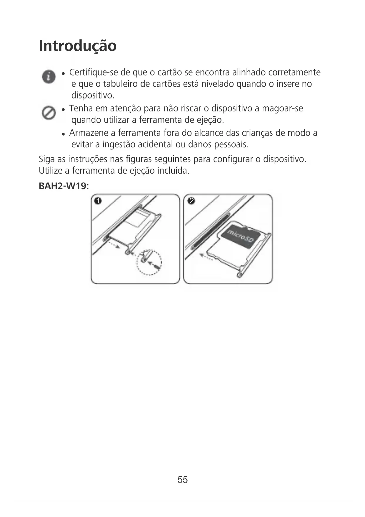Câmara frontal Altifalante Proximity sensor Sensor de luz ambiente Leitor de impressões digitais Entrada para auriculares Porta USB-C Tabuleiro dos cartões Câmara traseira Botão ligar/desligar Botão do volume Indicador de estado Português 53Microfone 54Introdução l Certique-se de que o cartão se encontra alinhado corretamente e que o tabuleiro de cartões está nivelado quando o insere no dispositivo. l Tenha em atenção para não riscar o dispositivo a magoar-se quando utilizar a ferramenta de ejeção. l Armazene a ferramenta fora do alcance das crianças de modo a evitar a ingestão acidental ou danos pessoais. Siga as instruções nas guras seguintes para congurar o dispositivo. Utilize a ferramenta de ejeção incluída. BAH2-W19: