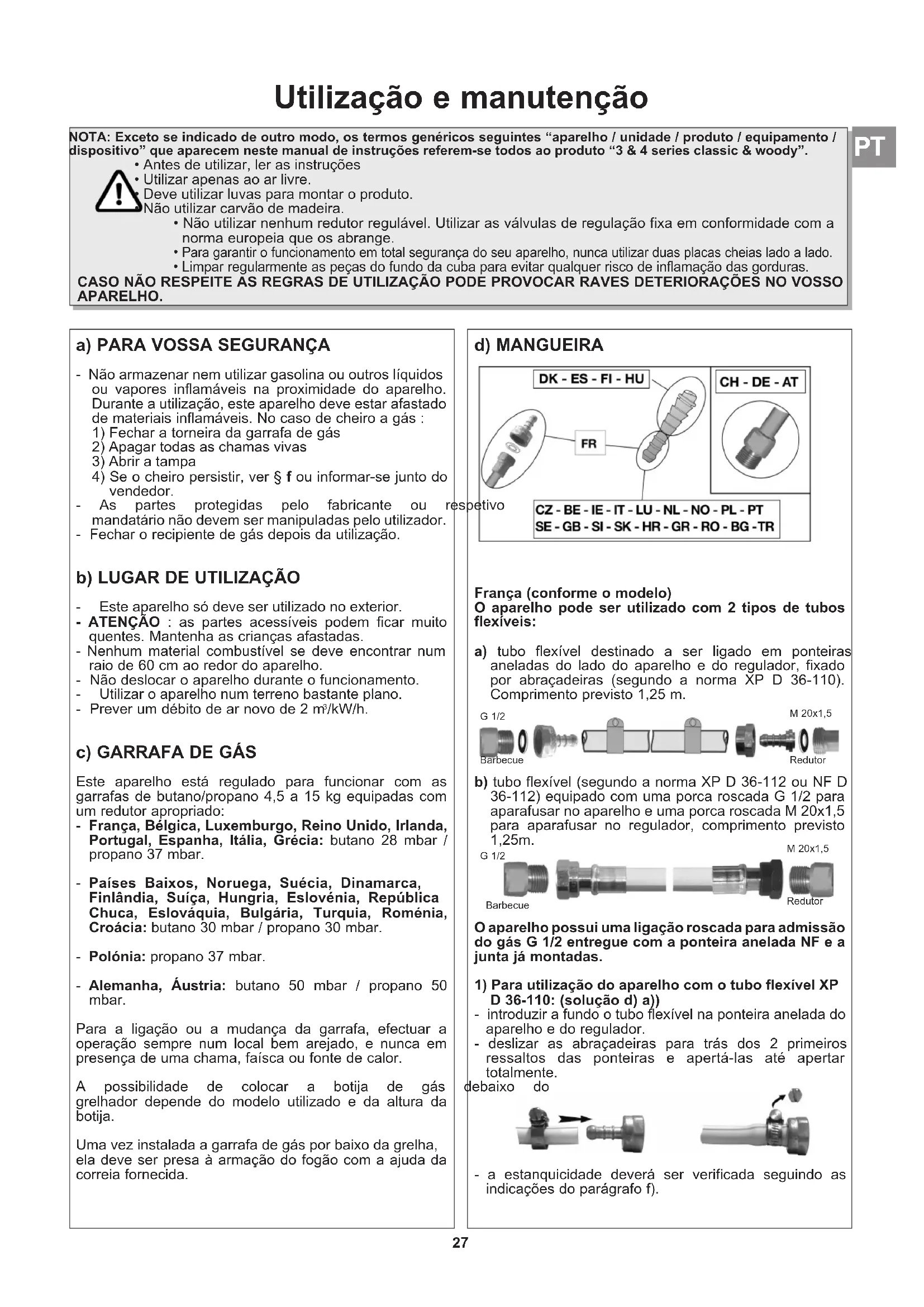 /kW/h. c) GARRAFA DE GÁS Este aparelho está regulado para funcionar com as garrafas de butano/propano 4,5 a 15 kg equipadas com um redutor apropriado: - França, Bélgica, Luxemburgo, Reino Unido, Irlanda, Portugal, Espanha, Itália, Grécia: butano 28 mbar / propano 37 mbar. - Países Baixos, Noruega, Suécia, Dinamarca, Finlândia, Suíça, Hungria, Eslovénia, República Chuca, Eslováquia, Bulgária, Turquia, Roménia, Croácia: butano 30 mbar / propano 30 mbar. - Polónia: propano 37 mbar. - Alemanha, Áustria: butano 50 mbar / propano 50 mbar. Para a ligação ou a mudança da garrafa, efectuar a operação sempre num local bem arejado, e nunca em presença de uma chama, faísca ou fonte de calor. A possibilidade de colocar a botija de gás debaixo do grelhador depende do modelo utilizado e da altura da botija. Umavezinstaladaagarrafadegásporbaixodagrelha, ela deve ser presa à armação do fogão com a ajuda da correia fornecida. d) MANGUEIRA França (conforme o modelo) O aparelho pode ser utilizado com 2 tipos de tubos flexíveis: a) tubo flexível destinado a ser ligado em ponteiras aneladas do lado do aparelho e do regulador, fixado por abraçadeiras (segundo a norma XP D 36-110). Comprimento previsto 1,25 m. b) tubo flexível (segundo a norma XP D 36-112 ou NF D 36-112) equipado com uma porca roscada G 1/2 para aparafusar no aparelho e uma porca roscada M 20x1,5 para aparafusar no regulador, comprimento previsto 1,25m. O aparelho possui uma ligação roscada para admissão do gás G 1/2 entregue com a ponteira anelada NF e a junta já montadas.