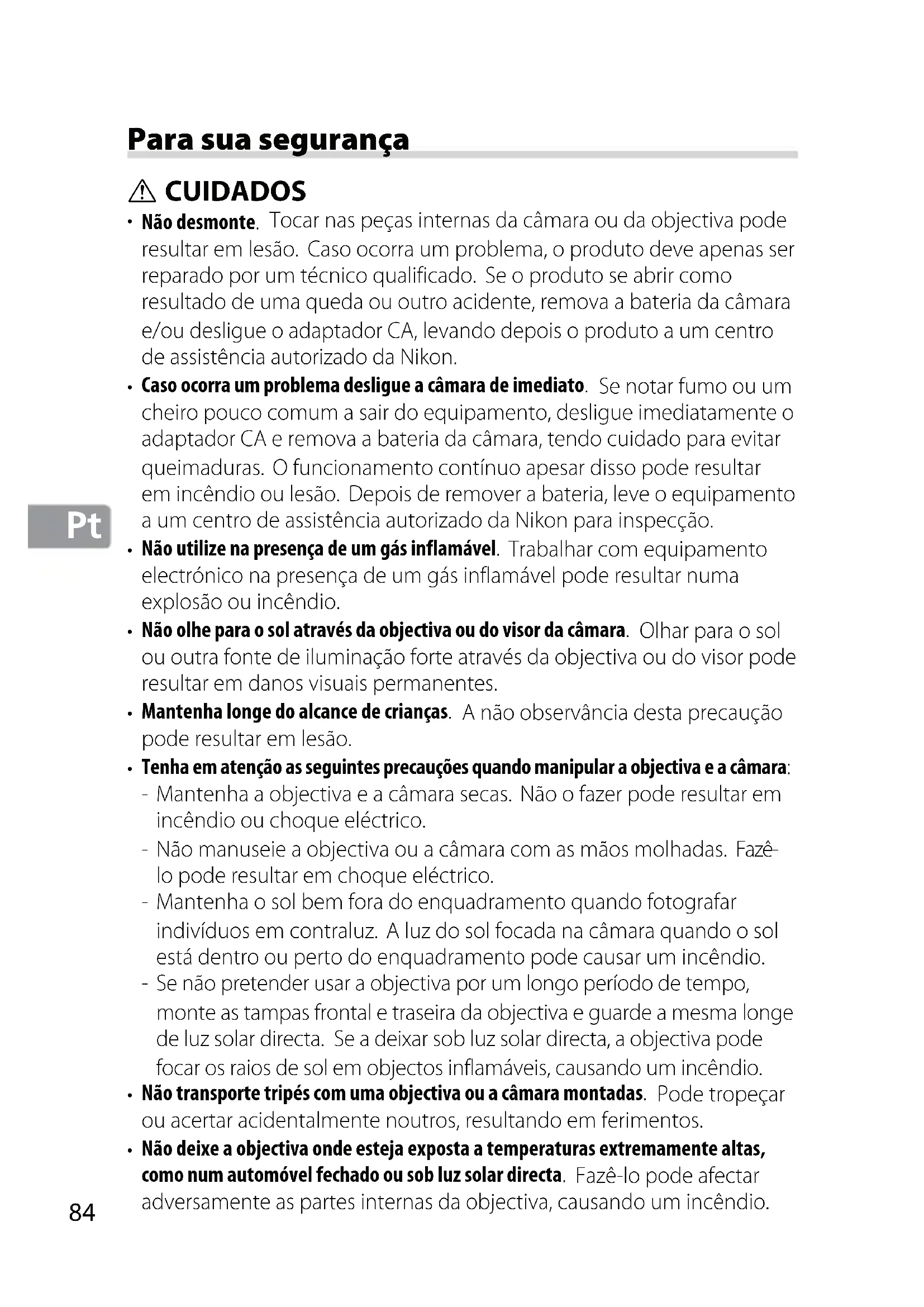 Para sua segurança CUIDADOS Não desmonte. Tocar nas peças internas da câmera ou da lente pode resultar em lesão. Caso ocorra um problema, o produto deve apenas ser reparado por um técnico qualificado. Se o produto se abrir, como resultado de uma queda ou outro acidente, remova a bateria da câmera e/ou desligue o adaptador AC, levando, depois, o produto a uma assistência técnica autorizada Nikon para inspeção. Caso ocorra um problema, desligue a câmera imediatamente. Se você notar fumaça ou um cheiro incomum saindo do equipamento, desligue imediatamente o adaptador AC e remova a bateria da câmera, tendo cuidado para evitar queimaduras. O funcionamento contínuo pode resultar em incêndio ou lesão. Depois de remover a bateria, leve o equipamento a uma assistência técnica autorizada Nikon para inspeção. Não utilize na presença de gás inflamável. Trabalhar com equipamento eletrônico na presença de gás inflamável pode resultar em uma explosão ou incêndio. Não olhe para o sol através da lente ou do visor da câmera. Olhar para o sol ou outra fonte de iluminação forte através da lente ou do visor pode resultar em danos visuais permanentes. Mantenha longe do alcance de crianças. A não observância desta precaução poderá resultar em lesão. Observe as seguintes precauções quando manipular a lente e a câmera: Mantenha a lente e a câmera secas. A não observância desta precaução poderá resultar em incêndio ou choque elétrico. Não manuseie a lente ou a câmera com as mãos molhadas. A não observância desta precaução poderá resultar em choque elétrico. Mantenha o sol fora do enquadramento quando fotografar temas em contraluz. A luz do sol, focada na câmera quando o sol está dentro ou perto do enquadramento, pode causar um incêndio. Se você não pretender usar a lente por um longo período de tempo, coloque as tampas frontal e traseira da lente e guarde a mesma longe de luz solar direta. Se a deixar sob luz solar direta, a lente poderá focar os raios de sol em objetos inflamáveis, causando um incêndio. Não transporte tripés com uma lente ou a câmera montada. Você pode tropeçar ou acertar acidentalmente outras pessoas, resultando em ferimentos. Não deixe a lente exposta a temperaturas extremamente altas, como num automóvel fechado ou na luz solar direta. A não observância desta precaução poderá afetar adversamente as partes internas da lente, causando um incêndio.