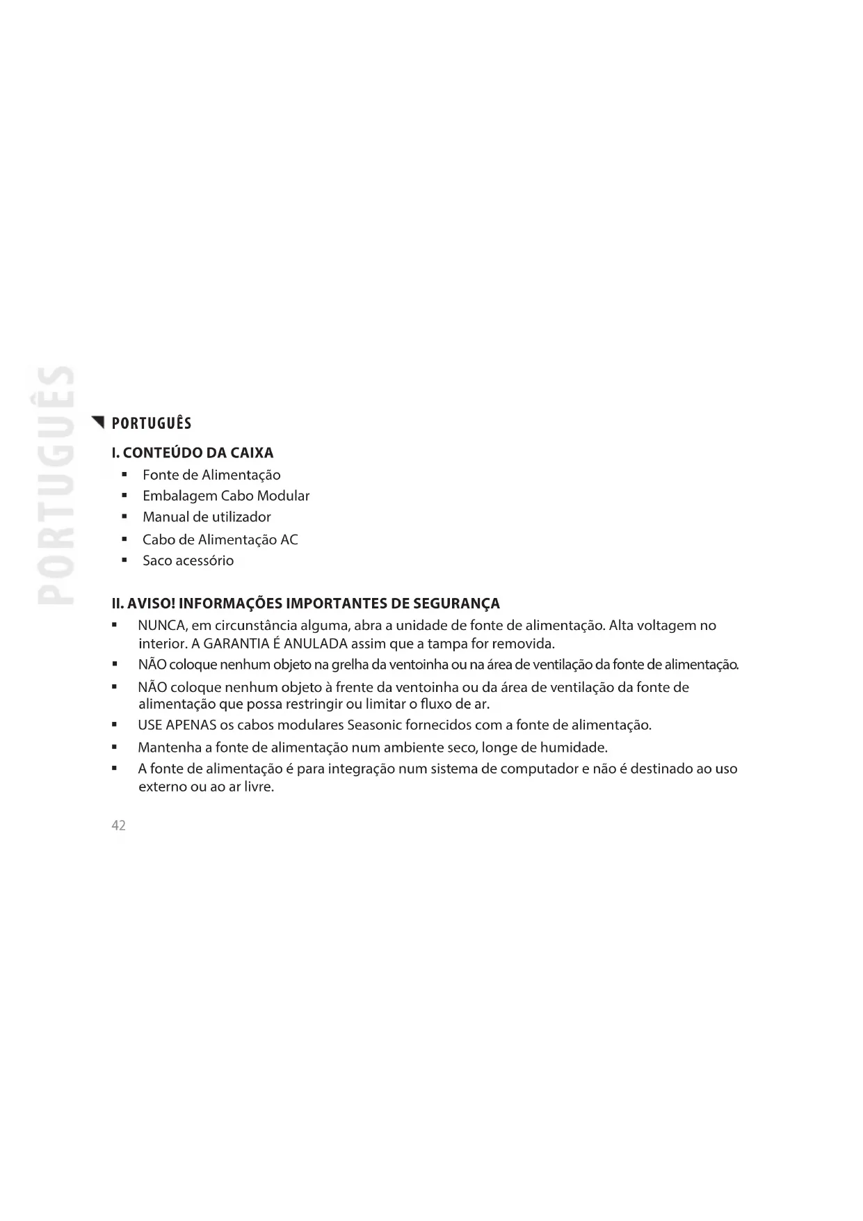A garantia Seasonic abrange todas as fontes de alimentação a partir da sua data de compra, contra defeitos de materiais ou mão de obra. Durante o período de garantia, a Seasonic mantém a descrição para reparar unidades ou substituir componentes defeituosos com peças de desempenho semelhante ou igual, desde que: