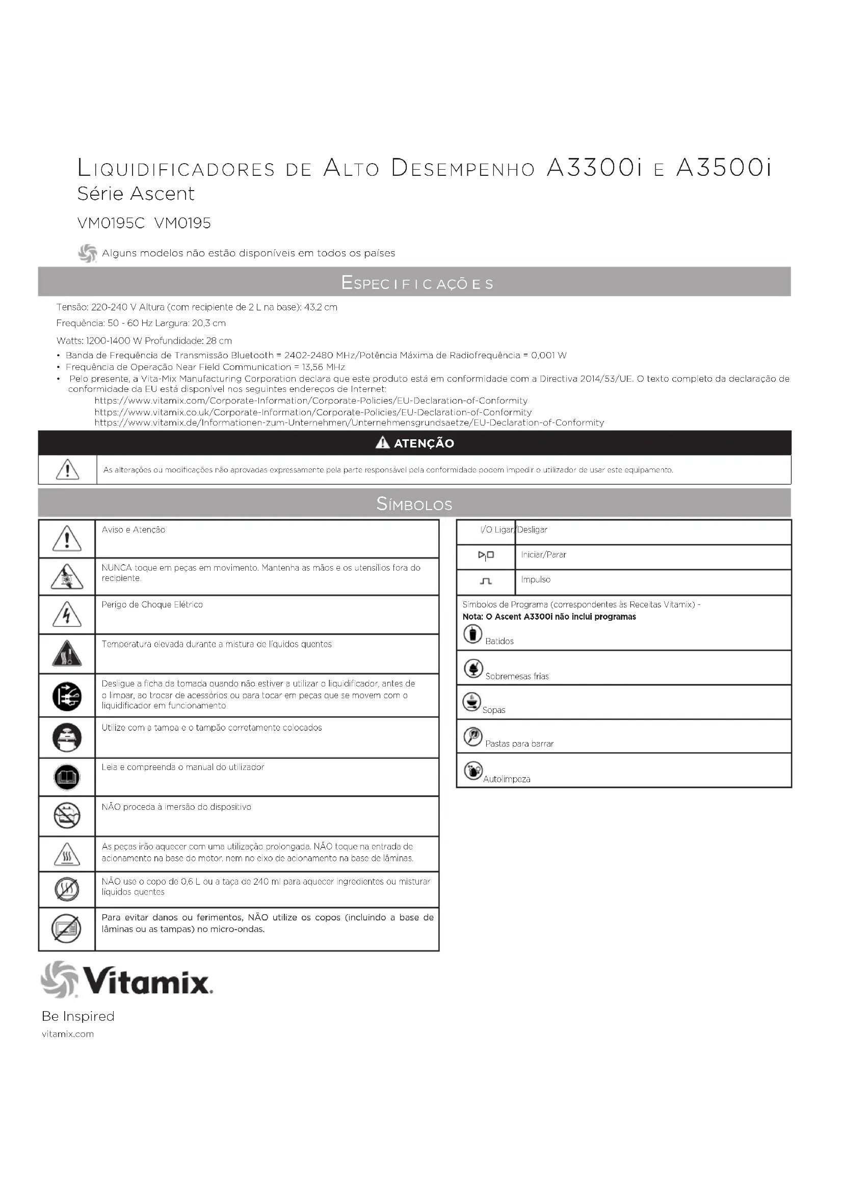 Dubái Emiratos Árabes Unidos Tel.: +971 (0) 561089662 www.vitality.ae info@vitality.ae 4Homes FZCO 61379, Dubái (Emiratos Árabes Unidos) Tel.: +971 4 3807611 Fax: +971 4 387612 4homes@4homes.ae www.tavolashop.com AUSTRALIA Y NUEVA ZELANDA Vitamix ANZ Pty Limited 167 King St Newcastle NSW2300 Australia Tel.: 1-800-766437 (Australia) Tel.: 050-853-0697 (Nueva Zelanda) www.vitamix.com.au www.vitamix.co.nzliquidificAdores de Alto desemPenHo A3300i e A3500i Série Ascent Be Inspiredvitamix.com VM0185 SímboloS eSpec i f i c açõ e S Tensão: 220-240 V Altura (com recipiente de 2 L na base): 43,2 cm Frequência: 50 - 60 Hz Largura: 20,3 cmWatts: 1200-1400 W Profundidade: 28 cmI/O Ligar/Desligar Iniciar/PararImpulsoSímbolos de Programa (correspondentes às Receitas Vitamix) - Nota: O Ascent A3300i não inclui programas Batidos Sobremesas frias Sopas Pastas para barrarAutolimpeza VM0195C VM0195 Alguns modelos não estão disponíveis em todos os países• Banda de Frequência de Transmissão Bluetooth = 2402-2480 MHz/Potência Máxima de Radiofrequência = 0,001 W• Frequência de Operação Near Field Communication = 13,56 MHz