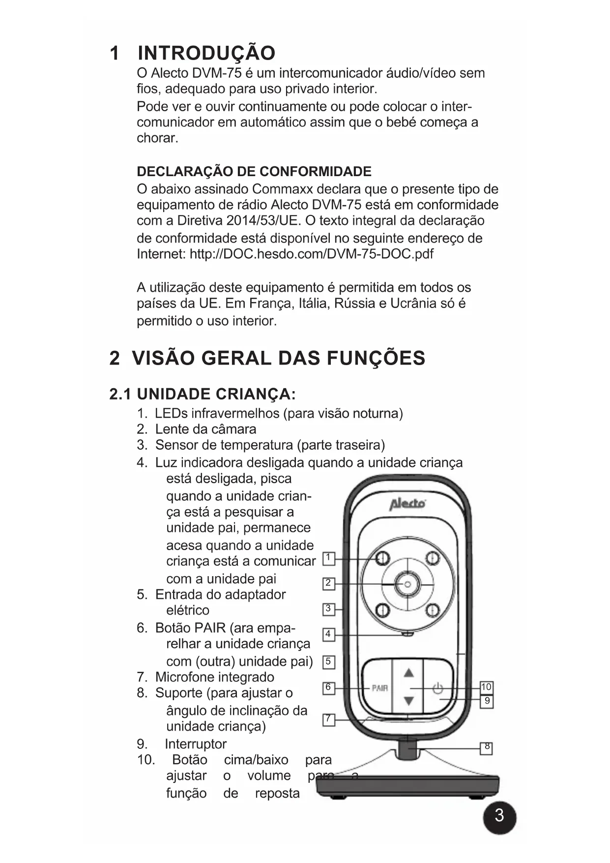 O abaixo assinado Commaxx declara que o presente tipo de equipamento de rádio Alecto DVM-75 está em conformidade com a Diretiva 2014/53/UE. O texto integral da declaração de conformidade está disponível no seguinte endereço de Internet: http://DOC.hesdo.com/DVM-75-DOC.pdf A utilização deste equipamento é permitida em todos os países da UE. Em França, Itália, Rússia e Ucrânia só é permitido o uso interior.