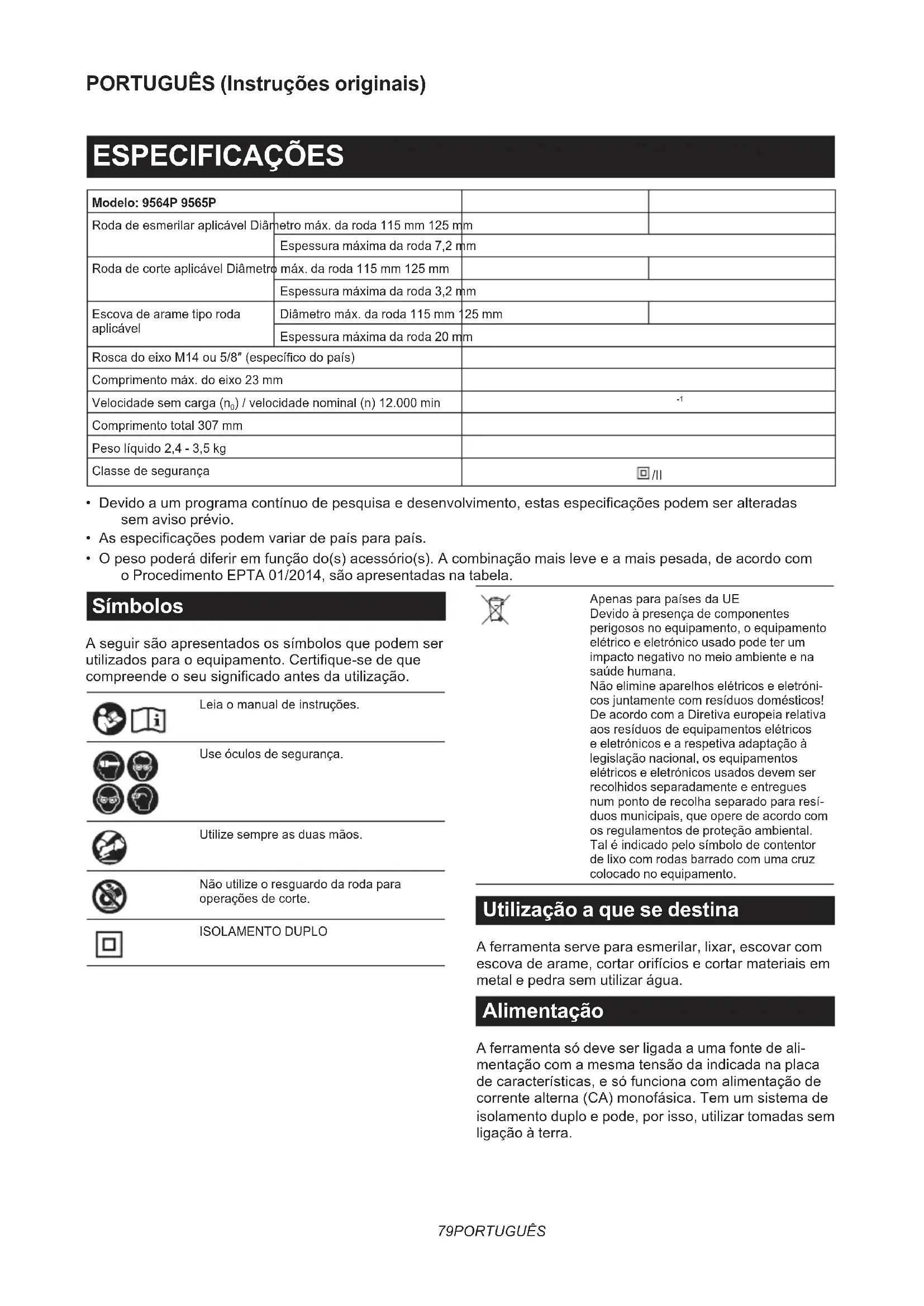 - O peso poderá diferir em função do(s) acessório(s). A combinação mais leve e a mais pesada, de acordo com o Procedimento EPTA 01/2014, são apresentadas na tabela. Símbolos A seguir são apresentados os símbolos que podem ser utilizados para o equipamento. Certique-se de que compreende o seu signicado antes da utilização. Leia o manual de instruções. Use óculos de segurança. Utilize sempre as duas mãos. Não utilize o resguardo da roda para operações de corte. ISOLAMENTO DUPLO Apenas para países da UE Devido à presença de componentes perigosos no equipamento, o equipamento elétrico e eletrónico usado pode ter um impacto negativo no meio ambiente e na saúde humana. Não elimine aparelhos elétricos e eletróni- cos juntamente com resíduos domésticos! De acordo com a Diretiva europeia relativa aos resíduos de equipamentos elétricos e eletrónicos e a respetiva adaptação à legislação nacional, os equipamentos elétricos e eletrónicos usados devem ser recolhidos separadamente e entregues num ponto de recolha separado para resí- duos municipais, que opere de acordo com os regulamentos de proteção ambiental. Tal é indicado pelo símbolo de contentor de lixo com rodas barrado com uma cruz colocado no equipamento. Utilização a que se destina A ferramenta serve para esmerilar, lixar, escovar com escova de arame, cortar orifícios e cortar materiais em metal e pedra sem utilizar água. Alimentação A ferramenta só deve ser ligada a uma fonte de ali- mentação com a mesma tensão da indicada na placa de características, e só funciona com alimentação de corrente alterna (CA) monofásica. Tem um sistema de isolamento duplo e pode, por isso, utilizar tomadas sem ligação à terra.80 PORTUGUÊS Ruído A característica do nível de ruído A determinado de acordo com a EN62841-2-3: Modelo Nível de pressão sonora (L