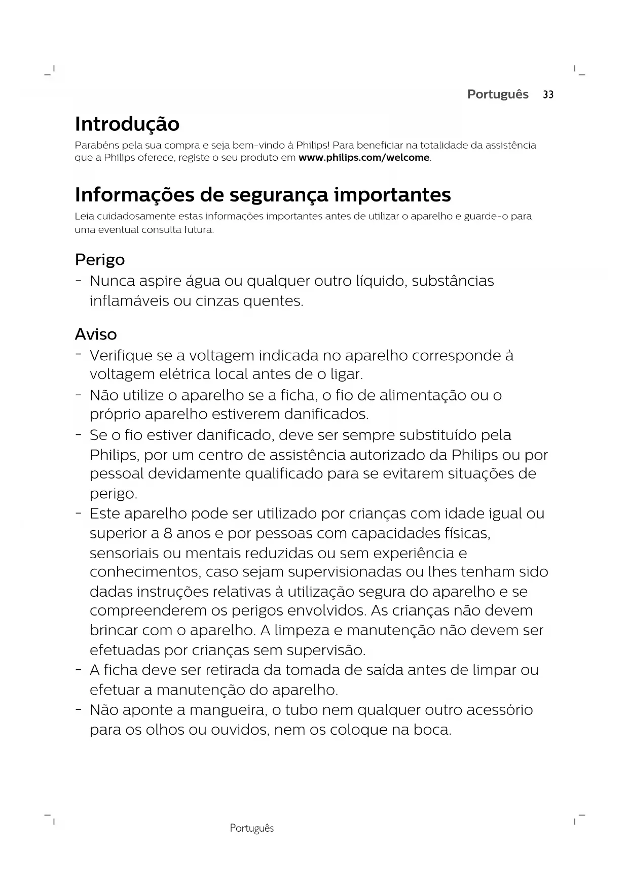 NorskPortuguês Introdução Parabéns pela sua compra e seja bem-vindo à Philips! Para beneficiar na totalidade da assistênciaque a Philips oferece, registe o seu produto em www.philips.com/welcome. Informações de segurança importantes Leia cuidadosamente estas informações importantes antes de utilizar o aparelho e guarde-o parauma eventual consulta futura. Perigo