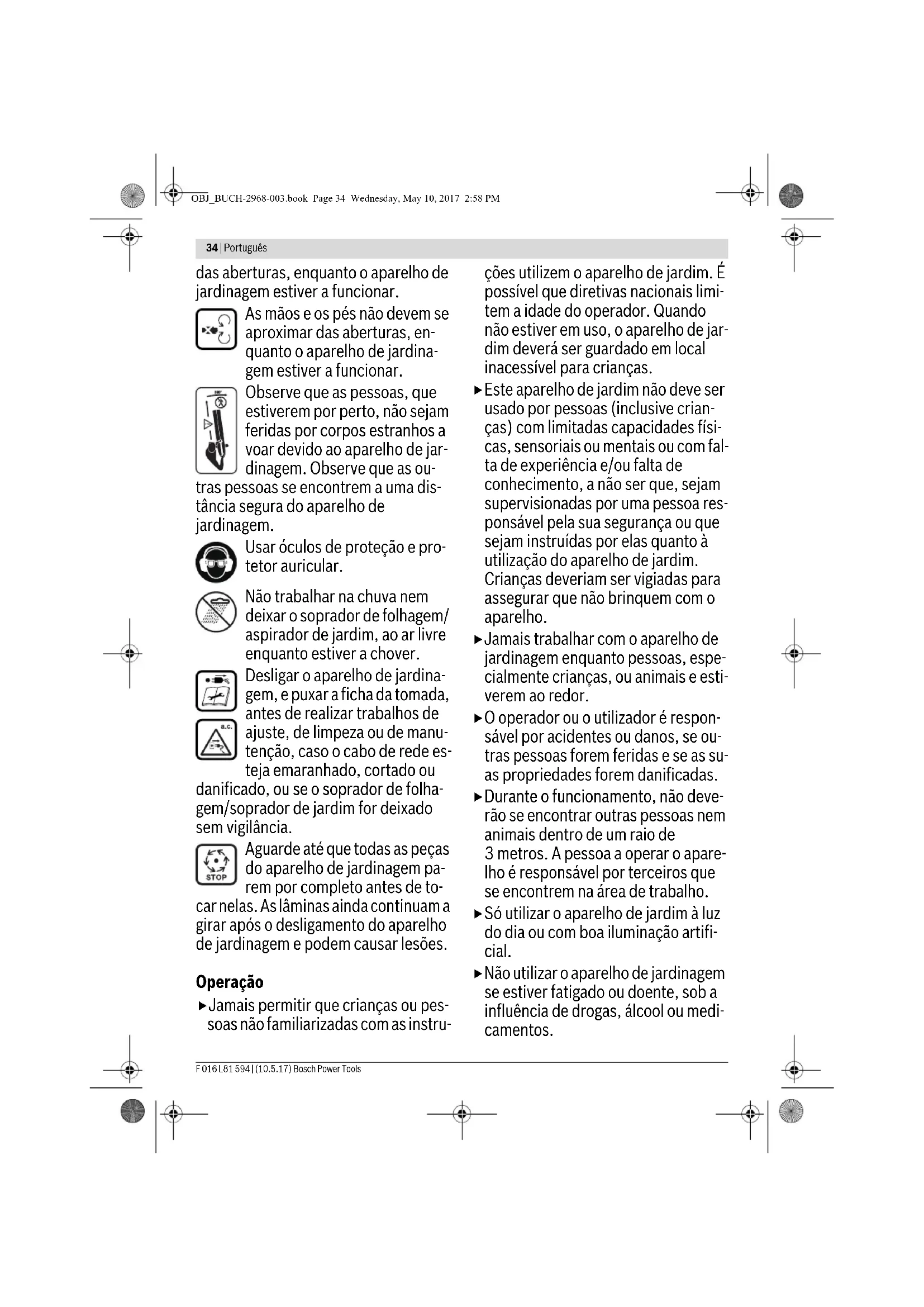 – Máximo comprimento de 30 m para o cabo de extensão ou 60 m para tam- bores de cabos com disjuntor de pro- teção contra corrente residual Nota: Se for utilizado um cabo de exten- são, este deve possuir um condutor de proteção – como descrito nas diretivas de segurança – conectado através de uma ficha ao condutor de proteção do seu equipamento elétrico. No caso de dúvidas consulte um eletri- cista especializado ou a representação de serviço pós-venda Bosch mais próxi- ma. CUIDADO: Cabos de extensão incorretos podem ser perigo- sos. Cabos de extensão, fi- chas e acoplamentos devem ser de modelos homologados para a utiliza- ção em áreas exteriores. OBJ_BUCH-2968-003.book Page 37 Wednesday, May 10, 2017 2:58 PM38 | Português F 016 L81 594 | (10.5.17) Bosch Power Tools Indicação para produtos, que não fo- ram vendidos na GB: ATENÇÃO: Para a sua segurança é ne- cessário que a ficha de rede do apare- lho de jardinagem esteja conectada ao cabo de extensão. O acoplamento do cabo de extensão deve ser protegido contra respingos de água, ser de borra- cha ou ter um revestimento de borra- cha. O cabo de extensão deve ser utili- zado com um protetor contra esforços mecânicos. Manutenção Controlar se todas as porcas, cavi- lhas e parafusos estão firmes, para assegurar-se de que o soprador de fo- lhagem/aspirador de jardim trabalhe de forma impecável. Armazenar soprador de folhagem/as- pirador de jardim em lugar seco, ele- vado e fechado, fora do alcance de crianças. Por precaução deverá substituir as peças gastas ou danificadas. Controlar o saco de recolha regular- mente quanto a desgaste ou danos. Não tente reparar o aparelho de jardi- nagem, a não ser que tenha a forma- ção necessária. Assegure-se de que as peças substi- tuídas sejam da Bosch. Símbolos Os símbolos a seguir são importantes para a leitura e para a compreensão destas instruções de serviço. Os símbolos e os seus significados devem ser memorizados. A interpretação correta dos símbolos facilita a utilização segura e aprimorada do aparelho de jardinagem. Utilização conforme as disposições O aparelho de jardinagem é destinado para soprar, amontoar e recolher folhagem, resíduos de jardinagem (por ex. relva) e galhos, em casas e jardins. O aparelho de jardinagem não deve ser usado como tritura- dor. A utilização de ferramentas elétricas de modo diferente do que explicitamente especificado pode ser perigoso. No caso de uso indevido poderá sofrer lesões. Símbolo Significado Modo para soprar folhagem Modo para aspirar folhagem Direção do movimento Direção da reação Ligar Desligar Ação permitida Ação proibida Usar luvas de proteção. Só operar o aparelho de jardinagem com o tubo de aspirador montado. Fabor puxar o parafuso para dentro da fer- ramente, até que a linha não seja mais visí- vel. OBJ_BUCH-2968-003.book Page 38 Wednesday, May 10, 2017 2:58 PMPortuguês | 39 Bosch Power Tools F 016 L81 594 | (10.5.17) Dados técnicos Informação sobre ruídos/vibrações Os valores de emissão de ruído determinados de acordo com EN 50636-2-100. O nível de ruído avaliado como A do aparelho é tipicamente: Nível de pressão acústica 82 dB(A); Nível de potência acústi- ca 102 dB(A). Incerteza K =3 dB. Usar proteção auricular! Totais valores de vibrações a