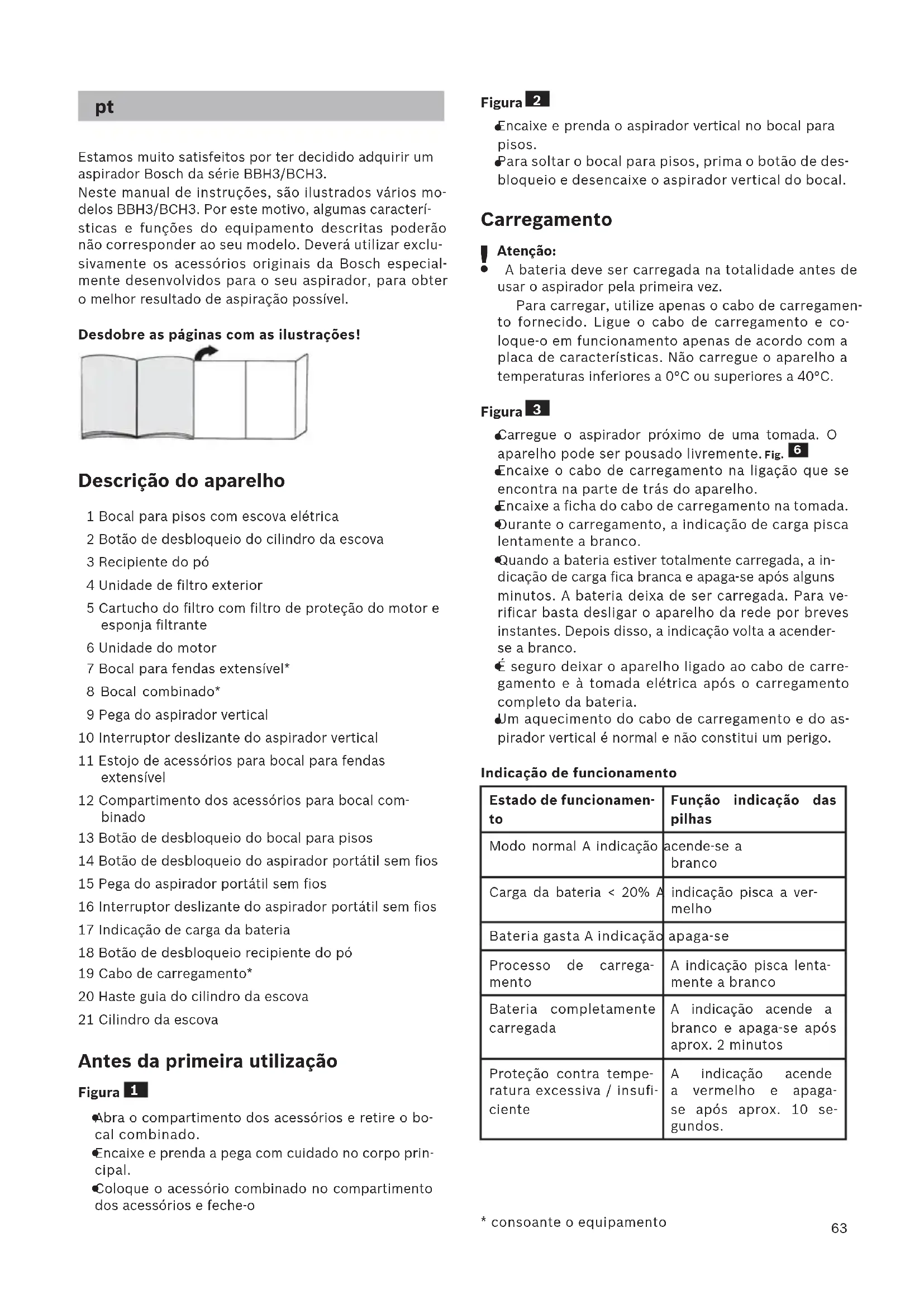 Estamos muito satisfeitos por ter decidido adquirir um aspirador Bosch da série BBH3/BCH3. Neste manual de instruções, são ilustrados vários mo- delos BBH3/BCH3. Por este motivo, algumas caracterí- sticas e funções do equipamento descritas poderão não corresponder ao seu modelo. Deverá utilizar exclu- sivamente os acessórios originais da Bosch especial- mente desenvolvidos para o seu aspirador, para obter o melhor resultado de aspiração possível. Desdobre as páginas com as ilustrações! Descrição do aparelho 1 Bocal para pisos com escova elétrica 2 Botão de desbloqueio do cilindro da escova 3 Recipiente do pó 4 Unidade de filtro exterior 5 Cartucho do filtro com filtro de proteção do motor e esponja filtrante 6 Unidade do motor 7 Bocal para fendas extensível* 8 Bocal combinado* 9 Pega do aspirador vertical 10 Interruptor deslizante do aspirador vertical 11 Estojo de acessórios para bocal para fendas extensível 12 Compartimento dos acessórios para bocal com- binado 13 Botão de desbloqueio do bocal para pisos 14 Botão de desbloqueio do aspirador portátil sem fios 15 Pega do aspirador portátil sem fios 16 Interruptor deslizante do aspirador portátil sem fios 17 Indicação de carga da bateria 18 Botão de desbloqueio recipiente do pó 19 Cabo de carregamento* 20 Haste guia do cilindro da escova 21 Cilindro da escova Antes da primeira utilização Figura