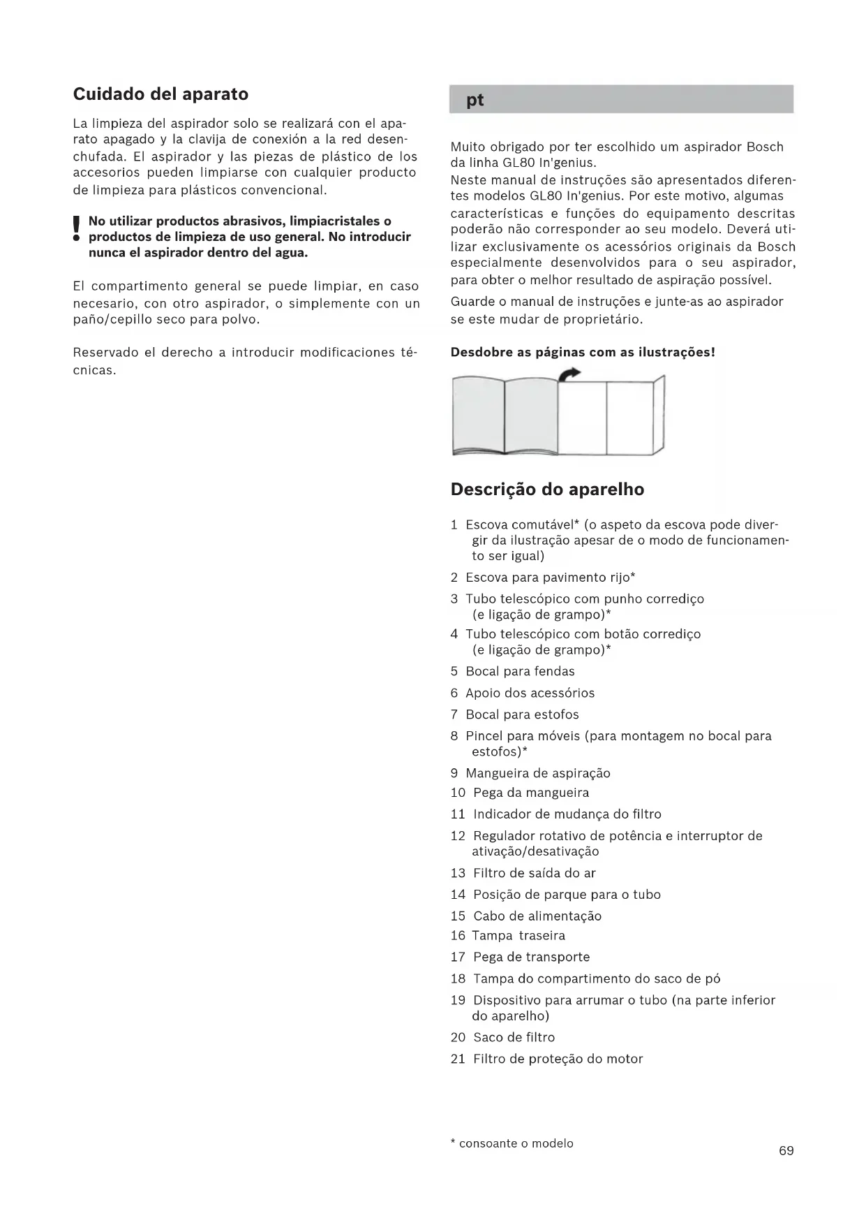 Muito obrigado por ter escolhido um aspirador Bosch da linha GL80 In'genius. Neste manual de instruções são apresentados diferen- tes modelos GL80 In'genius. Por este motivo, algumas características e funções do equipamento descritas poderão não corresponder ao seu modelo. Deverá uti- lizar exclusivamente os acessórios originais da Bosch especialmente desenvolvidos para o seu aspirador, para obter o melhor resultado de aspiração possível. Guarde o manual de instruções e junte-as ao aspirador se este mudar de proprietário. Desdobre as páginas com as ilustrações! Descrição do aparelho 1 Escova comutável* (o aspeto da escova pode diver- gir da ilustração apesar de o modo de funcionamen- to ser igual) 2 Escova para pavimento rijo* 3 Tubo telescópico com punho corrediço (e ligação de grampo)* 4 Tubo telescópico com botão corrediço (e ligação de grampo)* 5 Bocal para fendas 6 Apoio dos acessórios 7 Bocal para estofos 8 Pincel para móveis (para montagem no bocal para estofos)* 9 Mangueira de aspiração 10 Pega da mangueira 11 Indicador de mudança do filtro 12 Regulador rotativo de potência e interruptor de ativação/desativação 13 Filtro de saída do ar 14 Posição de parque para o tubo 15 Cabo de alimentação 16 Tampa traseira 17 Pega de transporte 18 Tampa do compartimento do saco de pó 19 Dispositivo para arrumar o tubo (na parte inferior do aparelho) 20 Saco de filtro 21 Filtro de proteção do motor