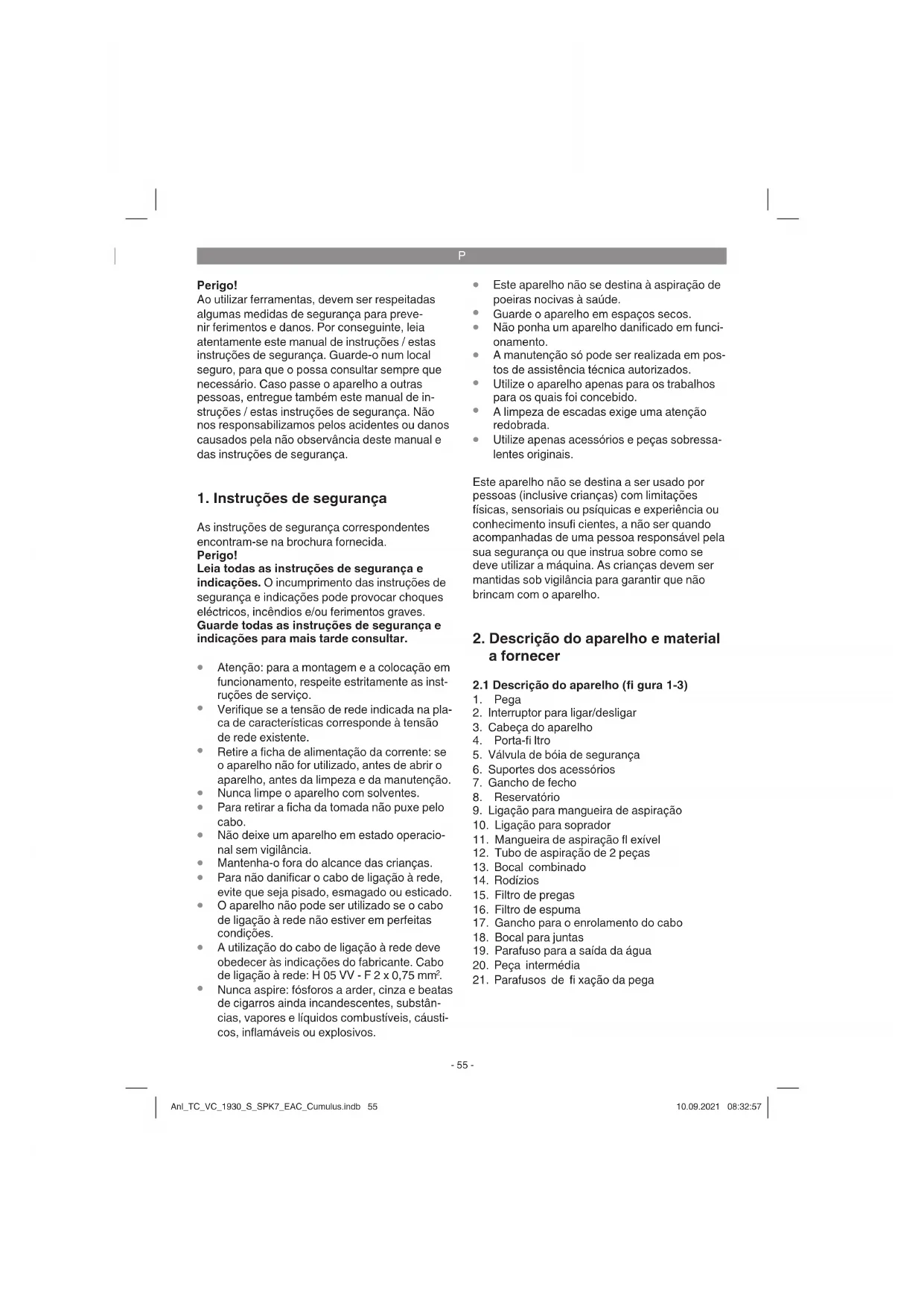 Só para países da UE Não deite as ferramentas eléctricas para o lixo doméstico! Segundo a directiva europeia 2012/19/CE relativa aos resíduos de equipamentos eléctricos e electró- nicos e a respectiva transposição para o direito interno, as ferramentas eléctricas usadas têm de ser recolhidas separadamente e entregues nos locais de recolha previstos para o efeito. Alternativa de reciclagem relativa à solicitação de devolução: O proprietário do aparelho eléctrico, no caso de não optar pela devolução, é obrigado a reciclar ade- quadamente o aparelho eléctrico. Para tal, o aparelho usado também pode ser entregue a um ponto de recolha que trate da eliminação de resíduos, respeitando a legislação nacional sobre resíduos e respectiva reciclagem. Não estão abrangidos os meios auxiliares e os acessórios sem componentes electrónicos, que acompanham os aparelhos usados. A reprodução ou duplicação, mesmo que parcial, da documentação e dos anexos dos produtos carece da autorização expressa da iSC GmbH. Reservado o direito a alterações técnicas Anl_TC_VC_1930_S_SPK7_EAC_Cumulus.indb 59Anl_TC_VC_1930_S_SPK7_EAC_Cumulus.indb 59 10.09.2021 08:32:5710.09.2021 08:32:57P