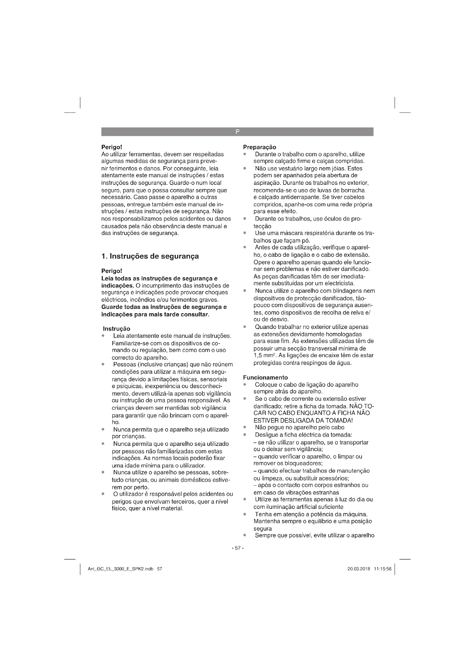 rações na mão e no braço, caso a ferramenta seja utilizada durante um longo período de tempo ou se não for operada e feita a manu- tenção de forma adequada. Anl_GC_EL_3000_E_SPK2.indb 59Anl_GC_EL_3000_E_SPK2.indb 59 20.03.2018 11:15:5620.03.2018 11:15:56P