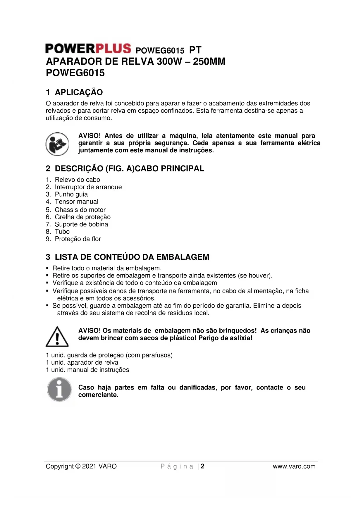 - Se possível, guarde a embalagem até ao fim do período de garantia. Elimine-a depois através do seu sistema de recolha de resíduos local. AVISO! Os materiais de embalagem não são brinquedos! As crianças não devem brincar com sacos de plástico! Perigo de asfixia! 1 unid. guarda de proteção (com parafusos) 1 unid. aparador de relva 1 unid. manual de instruções Caso haja partes em falta ou danificadas, por favor, contacte o seu comerciante.POWEG6015 PT Copyright © 2021 VARO P á g i n a | 3 www.varo.com 4 SÍMBOLOS Neste manual e/ou na máquina são utilizados os seguintes símbolos: