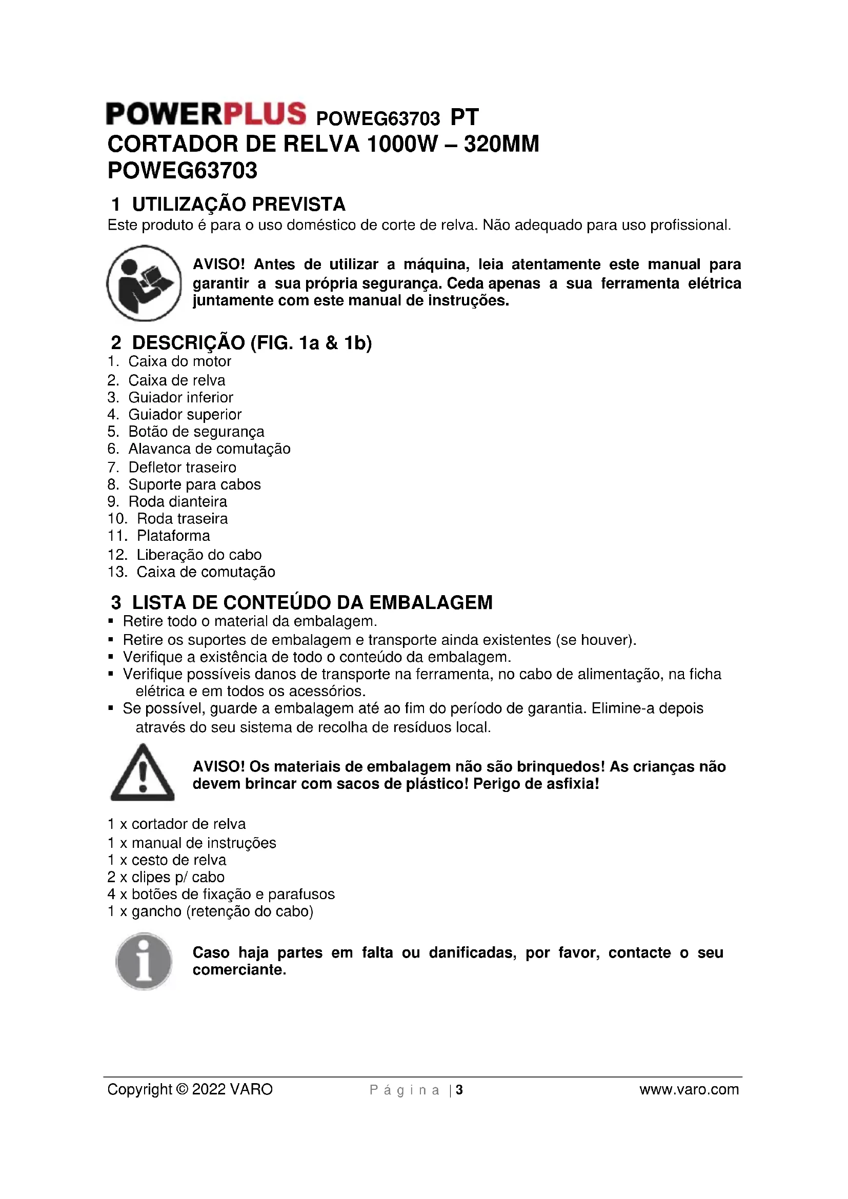 Se a caixa de recolha de relva não estiver instalada, a relva será expelida pela abertura traseira (entre a caixa do cortador de relva e a tampa traseira).POWEG63703 PT Copyright © 2022 VARO P á g i n a | 12 www.varo.com