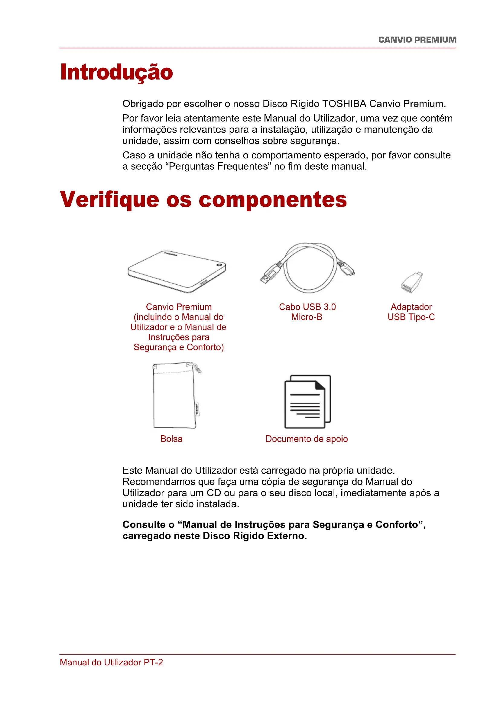 ) é inferior à capacidade indicada para a unidade? R: Esta diferença pode ser explicada pelos diferentes métodos utilizados para calcular a capacidade. Os fabricantes de discos rígidos fazem o cálculo utilizando o sistema decimal, enquanto que os sistema operativos utilizam o sistema binário. Exemplo decimal: 1TB = 1.000GB 1GB = 1.000MB = 1.000.000KB = 1.000.000.000 bytes Exemplo binário: 1GB = 1.024MB = 1.048.576KB = 1.073.741.824 bytes Assim, um disco rígido com uma capacidade de 1TB (decimal) é mostrado no Windows como tendo apenas 931GB (binário). P: Posso utilizar o meu disco rígido para copiar um sistema operativo de um computador para outro? R: Não, deve seguir as instruções do fornecedor do sistema operativo para fazer a instalação. Uma cópia simples não funciona. P: A Toshiba disponibiliza serviços de recuperação e dados? R: Sim, a Toshiba disponibiliza um Serviço de Recuperação de Dados para unidades externas. Por favor veja no nosso website www.toshiba-europe.com/services mais informações sobre este serviço. Resolução de problemas O meu computador não reconhece o disco rígido. ■ Verifique se todas as ligações estão correctas e bem firmes. ■ Se a sua unidade está ligada a um hub USB, certifique-se de que este tem a sua própria fonte de alimentação. ■ Se utilizar um cartão add-on, certifique-se de que está a funcionar correctamente e actualize o software/firmware. Existe perigo se a unidade estiver quente durante a operação? R: Isso é normal e não apresenta por isso qualquer perigo.Manual do Utilizador PT-7 CANVIO PREMIUM A unidade apresenta uma mensagem de erro “Device cannot start.” R: Existem duas razões possíveis. Ou se trata de um problema de alimentação e deve verificar as ligações, ou a unidade tem uma avaria e necessita de manutenção. Não consigo ver a minha unidade no “Meu Computador”, mas aparece no Gestor de Dispositivos. R: Siga estas instruções:
