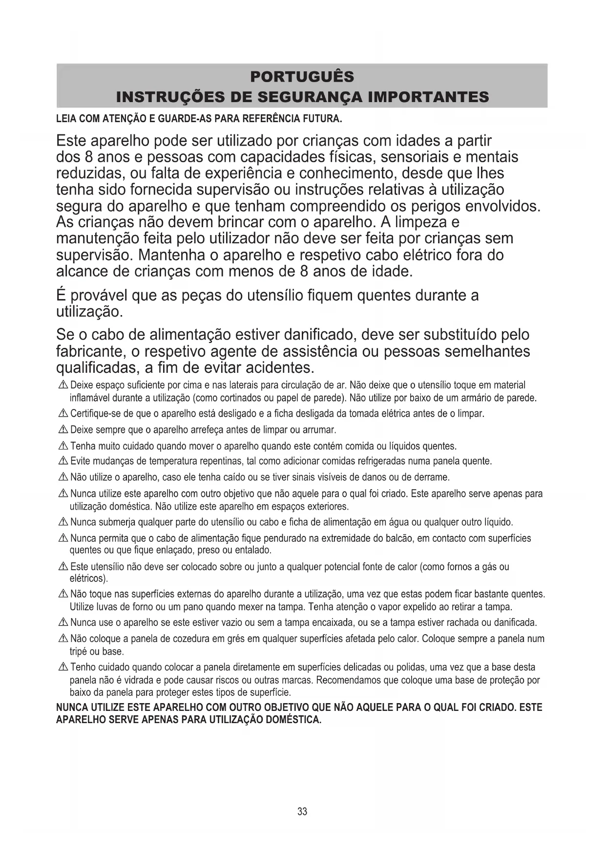 LEIA COM ATENÇÃO E GUARDE-AS PARA REFERÊNCIA FUTURA. Esteaparelhopodeserutilizadoporcriançascomidadesapartir dos8anosepessoascomcapacidadesfísicas,sensoriaisementais reduzidas,oufaltadeexperiênciaeconhecimento,desdequelhes tenhasidofornecidasupervisãoouinstruçõesrelativasàutilização segura do aparelho e que tenham compreendido os perigos envolvidos. Ascriançasnãodevembrincarcomoaparelho.Alimpezae manutençãofeitapeloutilizadornãodeveserfeitaporcriançassem supervisão. Mantenha o aparelho e respetivo cabo elétrico fora do alcance de crianças com menos de 8 anos de idade. Éprovávelqueaspeçasdoutensíliofiquemquentesdurantea utilização. Seocabodealimentaçãoestiverdanificado,devesersubstituídopelo fabricante, o respetivo agente de assistência ou pessoas semelhantes qualificadas, a fim de evitar acidentes. ! Deixe espaço suficiente por cima e nas laterais para circulação de ar. Não deixe que o utensílio toque em material inflamável durante a utilização (como cortinados ou papel de parede). Não utilize por baixo de um armário de parede. ! Certifique-se de que o aparelho está desligado e a ficha desligada da tomada elétrica antes de o limpar. ! Deixe sempre que o aparelho arrefeça antes de limpar ou arrumar. ! Tenha muito cuidado quando mover o aparelho quando este contém comida ou líquidos quentes. ! Evite mudanças de temperatura repentinas, tal como adicionar comidas refrigeradas numa panela quente. ! Não utilize o aparelho, caso ele tenha caído ou se tiver sinais visíveis de danos ou de derrame. ! Nunca utilize este aparelho com outro objetivo que não aquele para o qual foi criado. Este aparelho serve apenas para utilização doméstica. Não utilize este aparelho em espaços exteriores. ! Nunca submerja qualquer parte do utensílio ou cabo e ficha de alimentação em água ou qualquer outro líquido. ! Nunca permita que o cabo de alimentação fique pendurado na extremidade do balcão, em contacto com superfícies quentes ou que fique enlaçado, preso ou entalado. ! Este utensílio não deve ser colocado sobre ou junto a qualquer potencial fonte de calor (como fornos a gás ou elétricos). ! Não toque nas superfícies externas do aparelho durante a utilização, uma vez que estas podem ficar bastante quentes. Utilize luvas de forno ou um pano quando mexer na tampa. Tenha atenção o vapor expelido ao retirar a tampa. ! Nunca use o aparelho se este estiver vazio ou sem a tampa encaixada, ou se a tampa estiver rachada ou danificada. ! Não coloque a panela de cozedura em grés em qualquer superfícies afetada pelo calor. Coloque sempre a panela num tripé ou base. ! Tenho cuidado quando colocar a panela diretamente em superfícies delicadas ou polidas, uma vez que a base desta panela não é vidrada e pode causar riscos ou outras marcas. Recomendamos que coloque uma base de proteção por baixo da panela para proteger estes tipos de superfície. NUNCA UTILIZE ESTE APARELHO COM OUTRO OBJETIVO QUE NÃO AQUELE PARA O QUAL FOI CRIADO. ESTE APARELHO SERVE APENAS PARA UTILIZAÇÃO DOMÉSTICA.34