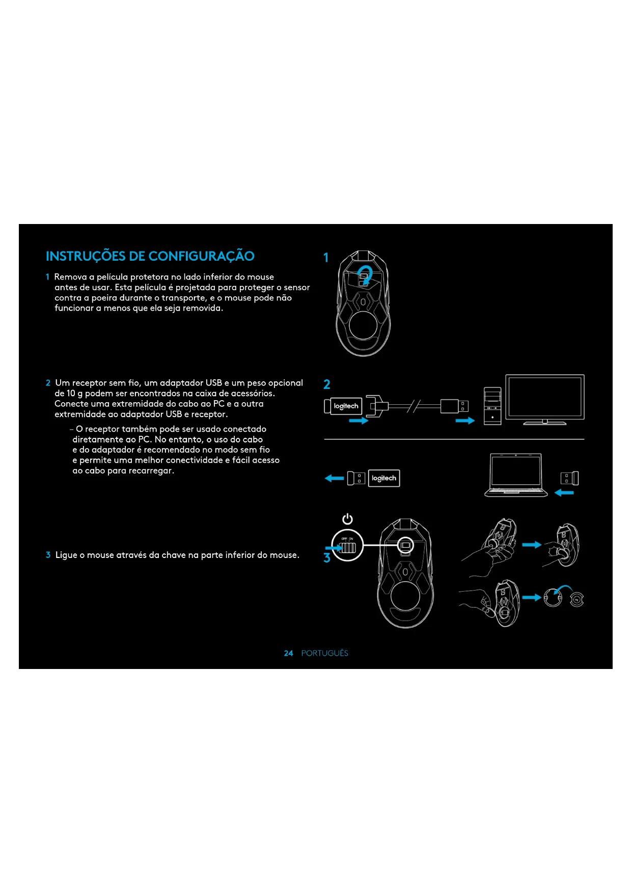 1 Remova a película protetora no lado inferior do mouse antesde usar. Esta película é projetada para proteger o sensor contra a poeira durante o transporte, e o mouse pode não funcionar a menos que ela seja removida. 2 Um receptor sem o, um adaptador USB e um peso opcional de 10 g podem ser encontrados na caixa de acessórios. Conecte uma extremidade do cabo ao PC e a outra extremidade ao adaptador USB e receptor. – O receptor também pode ser usado conectado diretamente ao PC. No entanto, o uso do cabo edoadaptador é recomendado no modo sem o epermite uma melhor conectividade e fácil acesso aocabo para recarregar. 3 Ligue o mouse através da chave na parte inferior do mouse.
