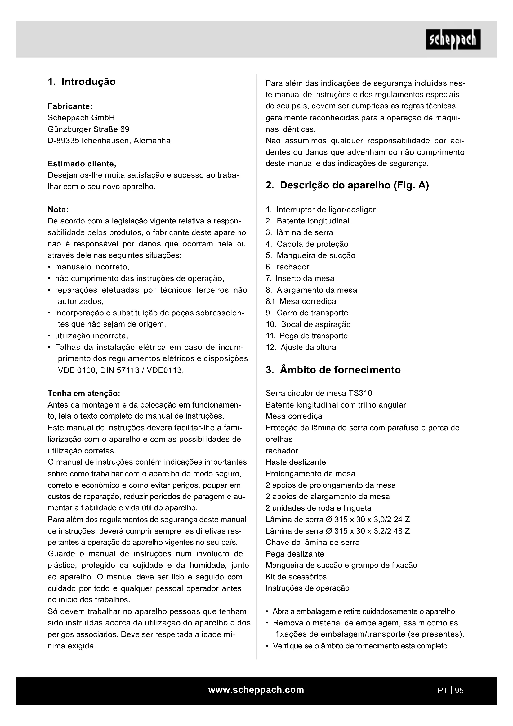 Fabricante: Scheppach GmbH Günzburger Straße 69 D-89335 Ichenhausen, Alemanha Estimado cliente, Desejamos-lhe muita satisfação e sucesso ao traba- lhar com o seu novo aparelho. Nota: De acordo com a legislação vigente relativa à respon- sabilidade pelos produtos, o fabricante deste aparelho não é responsável por danos que ocorram nele ou através dele nas seguintes situações: