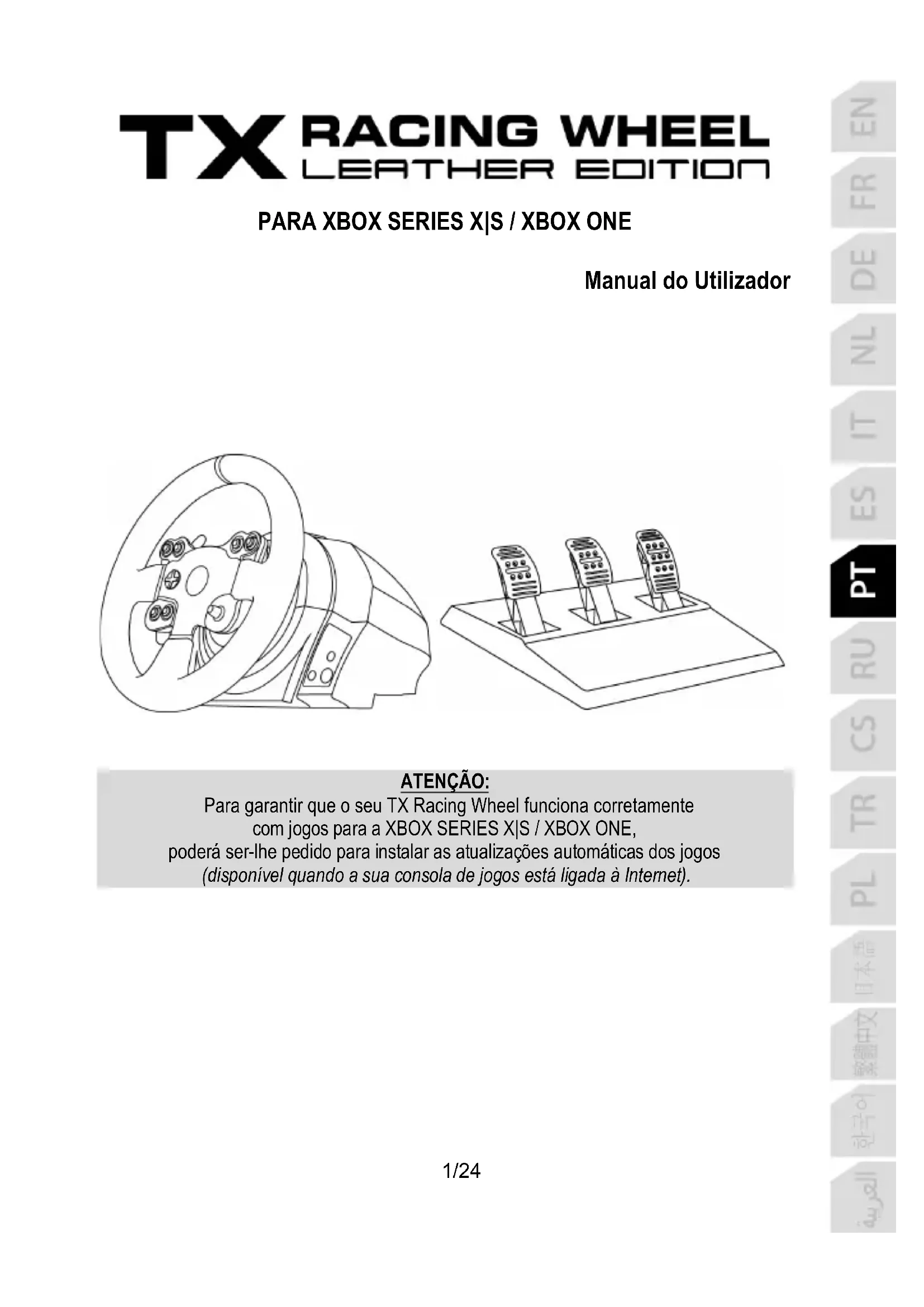 ATENÇÃO: Para garantir que o seu TX Racing Wheel funciona corretamente com jogos para a XBOX SERIES X|S / XBOX ONE, poderá ser-lhe pedido para instalar as atualizações automáticas dos jogos (disponível quando a sua consola de jogos está ligada à Internet).2/24