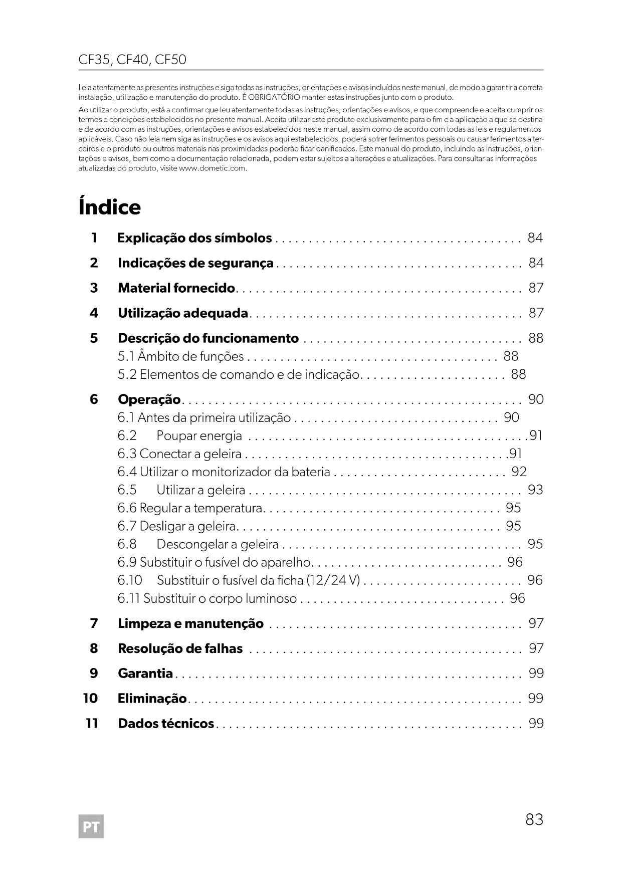 - Leia atentamente as presentes instruções e siga todas as instruções, orientações e avisos incluídos neste manual, de modo a garantir a correta instalação, utilização e manutenção do produto. É OBRIGATÓRIO manter estas instruções junto com o produto. Ao utilizar o produto, está a confirmar que leu atentamente todas as instruções, orientações e avisos, e que compreende e aceita cumprir os termos e condições estabelecidos no presente manual. Aceita utilizar este produto exclusivamente para o fim e a aplicação a que se destina e de acordo com as instruções, orientações e avisos estabelecidos neste manual, assim como de acordo com todas as leis e regulamentos aplicáveis. Caso não leia nem siga as instruções e os avisos aqui estabelecidos, poderá sofrer ferimentos pessoais ou causar ferimentos a ter- ceiros e o produto ou outros materiais nas proximidades poderão ficar danificados. Este manual do produto, incluindo as instruções, orien- tações e avisos, bem como a documentação relacionada, podem estar sujeitos a alterações e atualizações. Para consultar as informações atualizadas do produto, visite www.dometic.com. Índice 1 Explicação dos símbolos p. 84