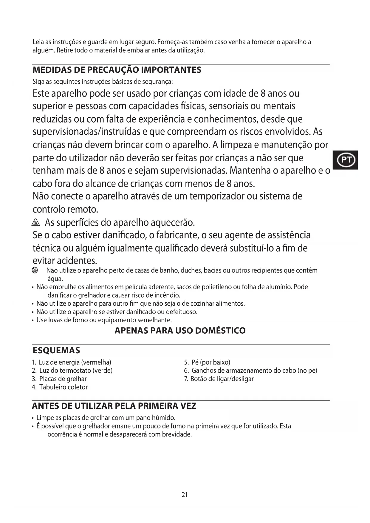 Siga as seguintes instruções básicas de segurança: Este aparelho pode ser usado por crianças com idade de 8 anos ou superior e pessoas com capacidades físicas, sensoriais ou mentais reduzidas ou com falta de experiência e conhecimentos, desde que supervisionadas/instruídas e que compreendam os riscos envolvidos. As crianças não devem brincar com o aparelho. A limpeza e manutenção por parte do utilizador não deverão ser feitas por crianças a não ser que tenham mais de 8 anos e sejam supervisionadas. Mantenha o aparelho e o cabo fora do alcance de crianças com menos de 8 anos. Não conecte o aparelho através de um temporizador ou sistema de controlo remoto. ¬ As superfícies do aparelho aquecerão. Se o cabo estiver danicado, o fabricante, o seu agente de assistência técnica ou alguém igualmente qualicado deverá substituí-lo a m de evitar acidentes. b Não utilize o aparelho perto de casas de banho, duches, bacias ou outros recipientes que contêm água.