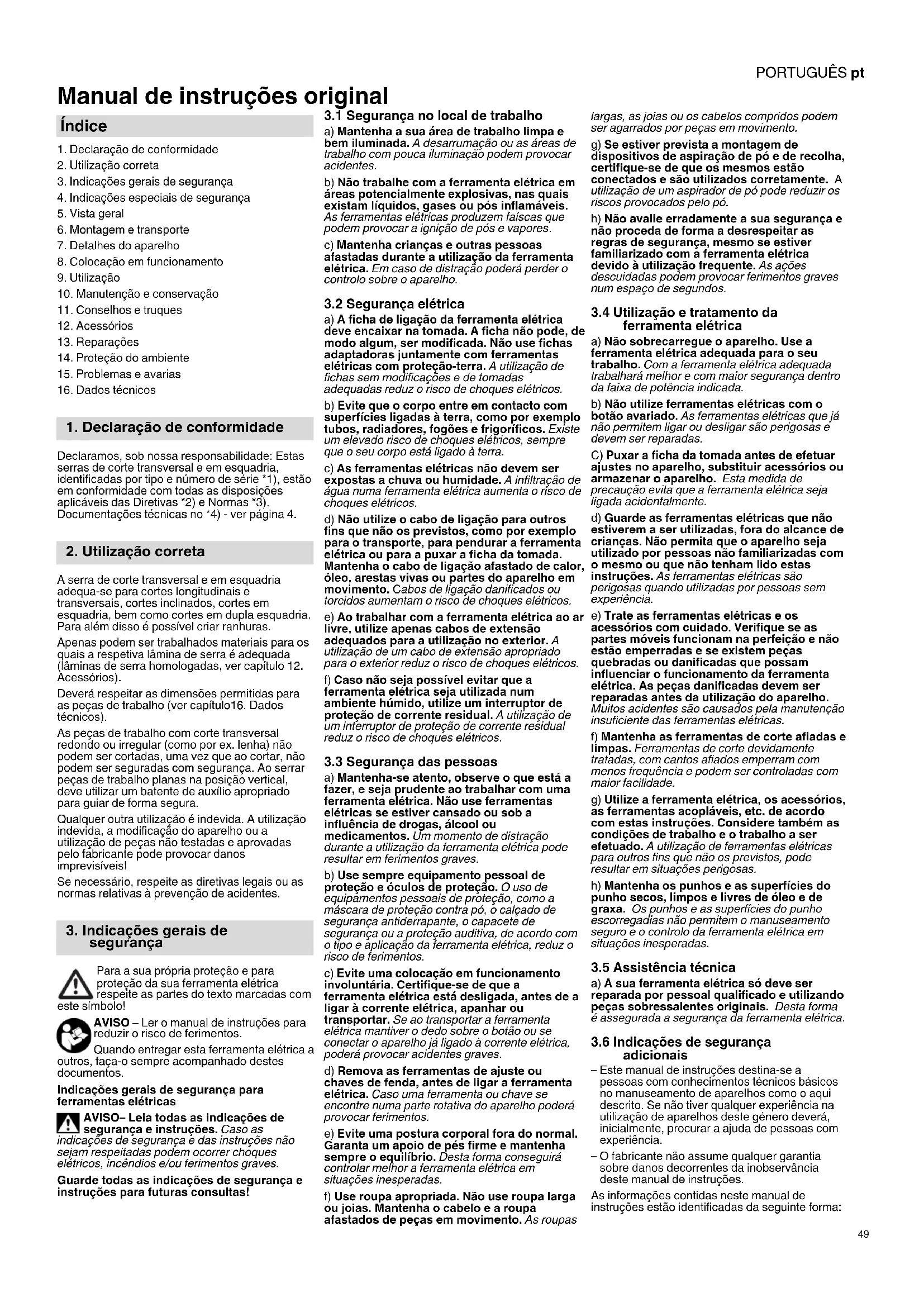 Declaramos, sob nossa responsabilidade: Estas serras de corte transversal e em esquadria, identificadas por tipo e número de série *1), estão em conformidade com todas as disposições aplicáveis das Diretivas *2) e Normas *3). Documentações técnicas no *4) - ver página 4. A serra de corte transversal e em esquadria adequa-se para cortes longitudinais e transversais, cortes inclinados, cortes em esquadria, bem como cortes em dupla esquadria. Para além disso é possível criar ranhuras. Apenas podem ser trabalhados materiais para os quais a respetiva lâmina de serra é adequada (lâminas de serra homologadas, ver capítulo 12. Acessórios). Deverá respeitar as dimensões permitidas para as peças de trabalho (ver capítulo16. Dados técnicos). As peças de trabalho com corte transversal redondo ou irregular (como por ex. lenha) não podem ser cortadas, uma vez que ao cortar, não podem ser seguradas com segurança. Ao serrar peças de trabalho planas na posição vertical, deve utilizar um batente de auxílio apropriado para guiar de forma segura. Qualquer outra utilização é indevida. A utilização indevida, a modificação do aparelho ou a utilização de peças não testadas e aprovadas pelo fabricante pode provocar danos imprevisíveis! Se necessário, respeite as diretivas legais ou as normas relativas à prevenção de acidentes. Para a sua própria proteção e para proteção da sua ferramenta elétrica respeite as partes do texto marcadas com este símbolo! AVISO – Ler o manual de instruções para reduzir o risco de ferimentos. Quando entregar esta ferramenta elétrica a outros, faça-o sempre acompanhado destes documentos. Indicações gerais de segurança para ferramentas elétricas AVISO– Leia todas as indicações de segurança e instruções. Caso as indicações de segurança e das instruções não sejam respeitadas podem ocorrer choques elétricos, incêndios e/ou ferimentos graves. Guarde todas as indicações de segurança e instruções para futuras consultas!