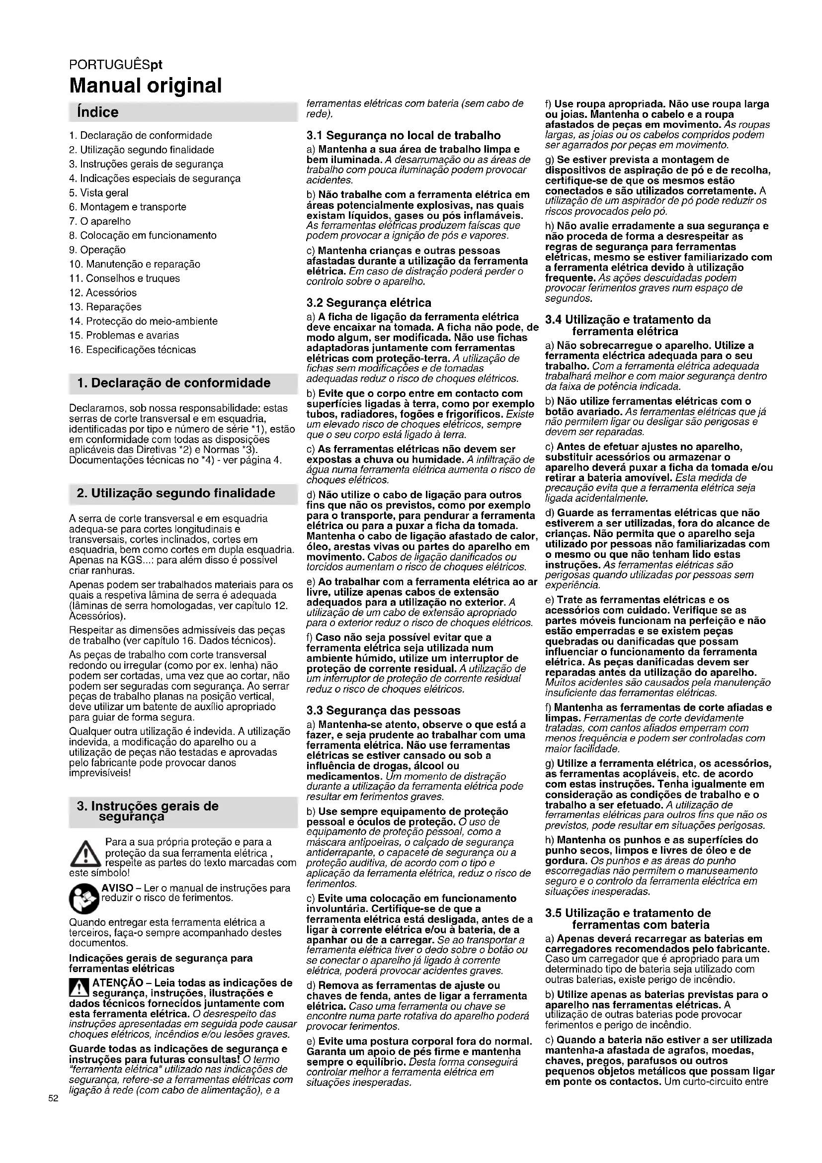 Declaramos, sob nossa responsabilidade: estas serras de corte transversal e em esquadria, identificadas por tipo e número de série *1), estão em conformidade com todas as disposições aplicáveis das Diretivas *2) e Normas *3). Documentações técnicas no *4) - ver página 4. A serra de corte transversal e em esquadria adequa-se para cortes longitudinais e transversais, cortes inclinados, cortes em esquadria, bem como cortes em dupla esquadria. Apenas na KGS...: para além disso é possível criar ranhuras. Apenas podem ser trabalhados materiais para os quais a respetiva lâmina de serra é adequada (lâminas de serra homologadas, ver capítulo 12. Acessórios). Respeitar as dimensões admissíveis das peças de trabalho (ver capítulo 16. Dados técnicos). As peças de trabalho com corte transversal redondo ou irregular (como por ex. lenha) não podem ser cortadas, uma vez que ao cortar, não podem ser seguradas com segurança. Ao serrar peças de trabalho planas na posição vertical, deve utilizar um batente de auxílio apropriado para guiar de forma segura. Qualquer outra utilização é indevida. A utilização indevida, a modificação do aparelho ou a utilização de peças não testadas e aprovadas pelo fabricante pode provocar danos imprevisíveis! Para a sua própria proteção e para a proteção da sua ferramenta elétrica , respeite as partes do texto marcadas com este símbolo! AVISO – Ler o manual de instruções para reduzir o risco de ferimentos. Quando entregar esta ferramenta elétrica a terceiros, faça-o sempre acompanhado destes documentos. Indicações gerais de segurança para ferramentas elétricas ATENÇÃO – Leia todas as indicações de segurança, instruções, ilustrações e dados técnicos fornecidos juntamente com esta ferramenta elétrica. O desrespeito das instruções apresentadas em seguida pode causar choques elétricos, incêndios e/ou lesões graves. Guarde todas as indicações de segurança e instruções para futuras consultas! O termo "ferramenta elétrica" utilizado nas indicações de segurança, refere-se a ferramentas elétricas com ligação à rede (com cabo de alimentação), e a ferramentas elétricas com bateria (sem cabo de rede).
