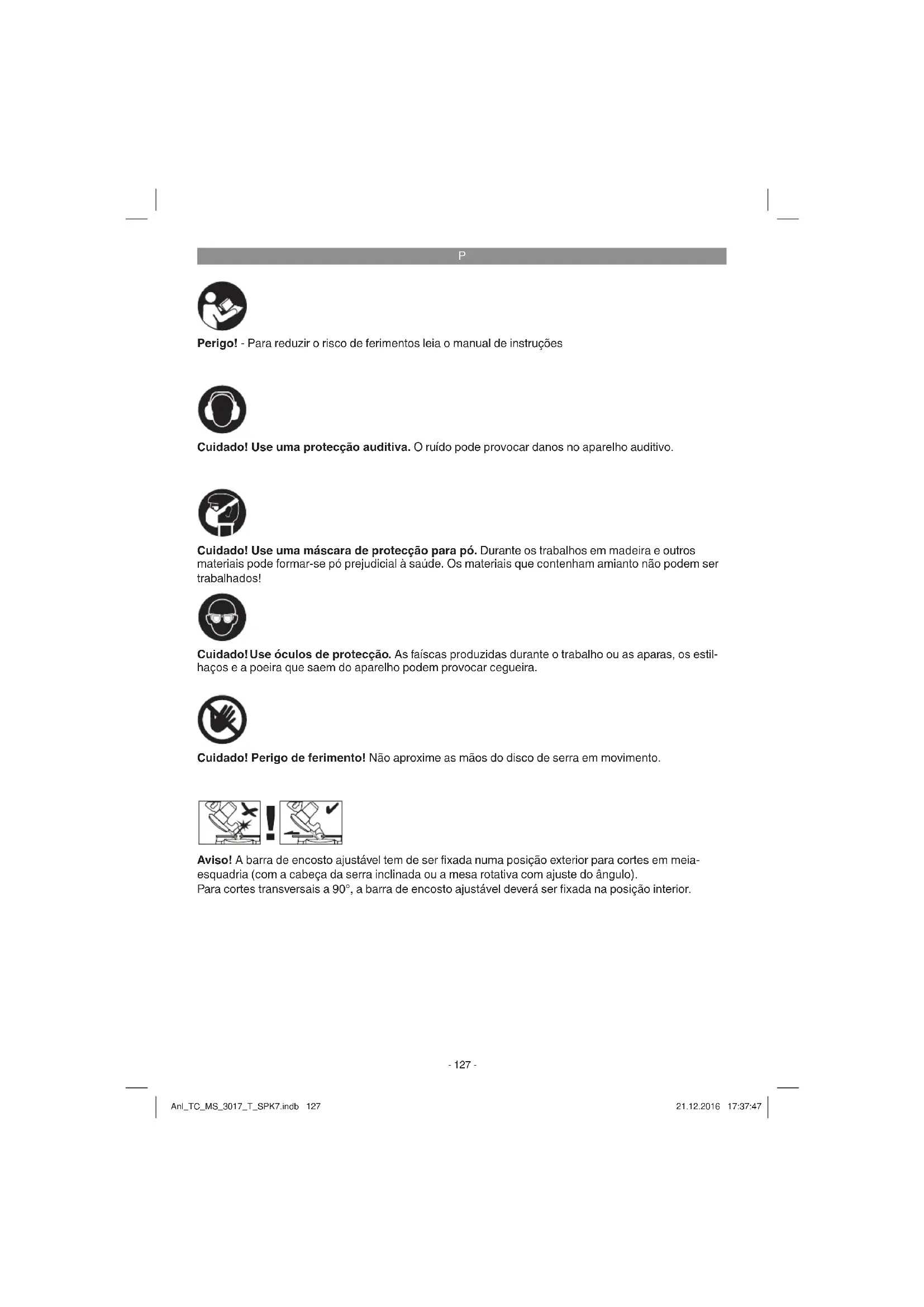 Perigo! - Para reduzir o risco de ferimentos leia o manual de instruções Cuidado! Use uma protecção auditiva. O ruído pode provocar danos no aparelho auditivo. Cuidado! Use óculos de protecção. As faíscas produzidas durante o trabalho ou as aparas, os estil- haços e a poeira que saem do aparelho podem provocar cegueira. Cuidado! Use uma máscara de protecção para pó. Durante os trabalhos em madeira e outros materiais pode formar-se pó prejudicial à saúde. Os materiais que contenham amianto não podem ser trabalhados! Cuidado! Perigo de ferimento! Não aproxime as mãos do disco de serra em movimento. Aviso! A barra de encosto ajustável tem de ser fi xada numa posição exterior para cortes em meia- esquadria (com a cabeça da serra inclinada ou a mesa rotativa com ajuste do ângulo). Para cortes transversais a 90°, a barra de encosto ajustável deverá ser fi xada na posição interior. Anl_TC_MS_3017_T_SPK7.indb 127Anl_TC_MS_3017_T_SPK7.indb 127 21.12.2016 17:37:4721.12.2016 17:37:47P