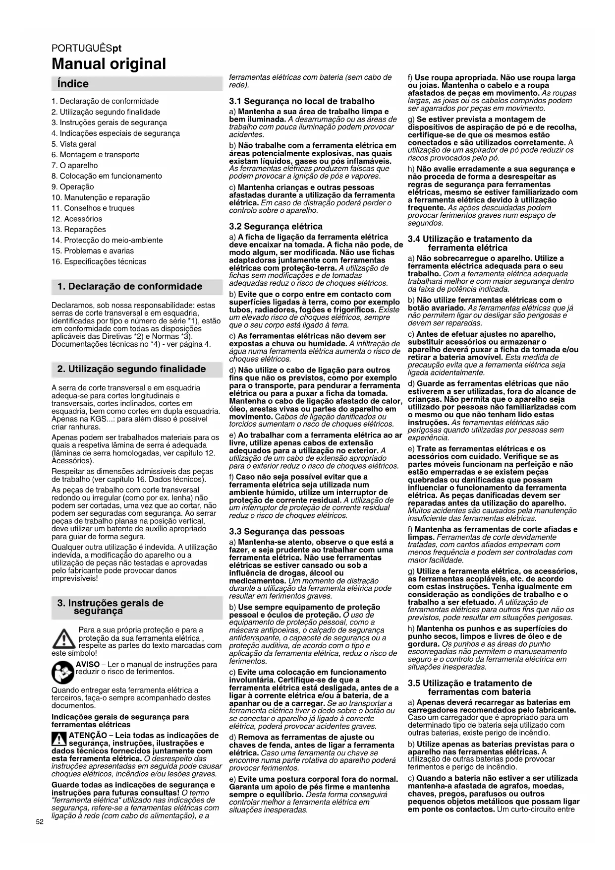 manter a distância suficiente entre os componentes em movimento. Espere que a lâmina de serra pare antes de retirar pequenos recortes da peça de trabalho, restos de madeira, etc. da zona de trabalho. Apenas deverá serrar peças em trabalho cujas dimensões permitam uma fixação segura durante a execução do trabalho. Utilize dispositivos de fixação ou um torno de bancada para segurar a peça de trabalho. Através disso ficará melhor fixado do que com a mão. Nunca trave a lâmina de serra em movimento por inércia exercendo pressão lateral. Puxe sempre a ficha de rede ou retire a bateria amovível antes de qualquer ajuste, manutenção ou reparação. Caso a ferramenta não esteja a ser utilizada, retire a ficha de rede ou a bateria amovível. Perigo de corte mesmo com a ferramenta de corte parada! Use luvas de proteção durante a substituição de ferramentas de corte. Guarde as lâminas de serra de forma a que ninguém se possa ferir. Perigo devido a contragolpes da cabeça da serra (a lâmina de serra fica presa na peça de trabalho e a cabeça da serra descontrola-se abruptamente)! Utilize uma lâmina de serra adequada para o material a cortar. Segure firmemente no punho. O risco de contragolpe é especialmente elevado no momento em que a lâmina de serra penetra na peça de trabalho. Serre peças de trabalho finas ou paredes finas apenas com lâminas de serra com dentes finos. Utilize sempre lâminas de serra afiadas. Substitua imediatamente as lâminas de serra cegas. Existe perigo acrescido de contragolpes, caso um dente cego fique preso na superfície da peça de trabalho. Nunca incline as peças. No caso de dúvidas, examine as peças em trabalho em relação a corpos estranhos (por exemplo, pregos ou parafusos). Nunca corte várias peças simultaneamente – nem nenhum feixe, composto de diversas peças individuais. Existe o risco de acidentes quando diversas peças individuais são agarradas descontroladamente pelo disco da serra. Apenas na KGS...: ao criar ranhuras evite exercer pressão lateral sobre a lâmina de serra – utilize um dispositivo de fixação. Perigo de arrasto! Certifique-se de que durante o funcionamento, as peças em rotação não agarram nem puxam partes do corpo ou peças de roupa (não usar gravatas, não usar luvas, nem usar peças de roupa com mangas largas; no caso de cabelos compridos colocar sempre uma rede). Nunca serrar peças de trabalho que contenham cordas, cordões, fitas, cabos ou arames ou que sejam compostas por estes materiais. Perigo devido a equipamento de proteção pessoal insuficiente! Use protecção auricular. Use óculos de protecção. Use máscara de protecção contra o pó. Use roupa de trabalho adequada. Use calçado antiderrapante. Utilize luvas de proteção ao manusear lâminas de serra e peças de trabalho rugosas. Transporte as lâminas de serra num recipiente. Perigo provocado por pó de madeira! Trabalhe sempre com um dispositivo de aspiração. O dispositivo de aspiração deve cumprir os valores mencionados no capítulo 16. Reduzir os níveis de pó: as partículas que se formam ao trabalhar com esta máquina podem conter substâncias cancerígenas e provocar reações alérgicas, doenças respiratórias, malformações congénitas ou outros problemas no sistema reprodutor. Alguns exemplos destas substâncias são: chumbo (em tintas à base de chumbo), aditivos para o tratamento de madeira (cromo, agente de preservação de madeira), alguns tipos de madeira (como pó de carvalho ou faia). O risco depende do tempo a que o utilizador, ou as pessoas que se encontram nas proximidades, estão sujeitos à sobrecarga. Não deixe que estas partículas entrem em contacto com o seu corpo. Para reduzir a sobrecarga destas substâncias: areje bem o local de trabalho e use equipamento de proteção adequado, como por ex. máscaras de proteção respiratória, que estejam em condições de filtrar partículas microscópicas. Respeite as diretivas (por ex. disposições relativas à segurança no trabalho, eliminação) válidas para o seu material, pessoal, caso de utilização e local de utilização. Apanhe as partículas geradas no local de origem das mesmas e evite deposições nas imediações. Utilize o dispositivo de recolha de pó juntamente fornecido e um aspirador de pó adequado. Através disso é reduzida a expulsão descontrolada de partículas no ambiente. Reduza os níveis de pó: – direcionando as partículas expelidas e o fluxo de ar de exaustão da máquina para longe de si e das pessoas que se encontram nas proximidades ou do pó acumulado, – montando um dispositivo de aspiração e/ou um purificador de ar, – arejando bem o local de trabalho e aspirando- o para o manter limpo. Varrer ou soprar por jato de ar forma remoinhos de pó. – Aspire ou lave o vestuário de proteção. Não limpar soprando, batendo ou escovando. Perigo devido a modificações técnicas ou devido à utilização de peças que não foram testadas nem aprovadas pelo fabricante! Monte o aparelho seguindo estritamente as instruções do fabricante. Utilize apenas peças autorizadas pelo fabricante, especialmente no caso das peças seguintes: Especialmente no caso de: – lâminas de serra (número de pedido ver capítulo 12. Acessórios). – dispositivos de segurança; – Indicação da linha de corte Não efectue modificações em nenhuma peça. Certifique-se de que as rotações máx. indicadas na lâmina de serra são no mínimo tão elevadas quanto as rotações indicadas na serra. Perigo devido a danos no aparelho! Antes de iniciar o funcionamento, verifique se não há nenhum estrago: para poder continuar a utilizar o aparelho, verifique se o que o funcionamento dos dispositivos de segurança e protecção, além das peças estragadas, está correcto e conforme para com a sua finalidade. Controlar se todas as peças móveis funcionam correctamente e não estão emperradas. Para garantir o funcionamento correto do ap