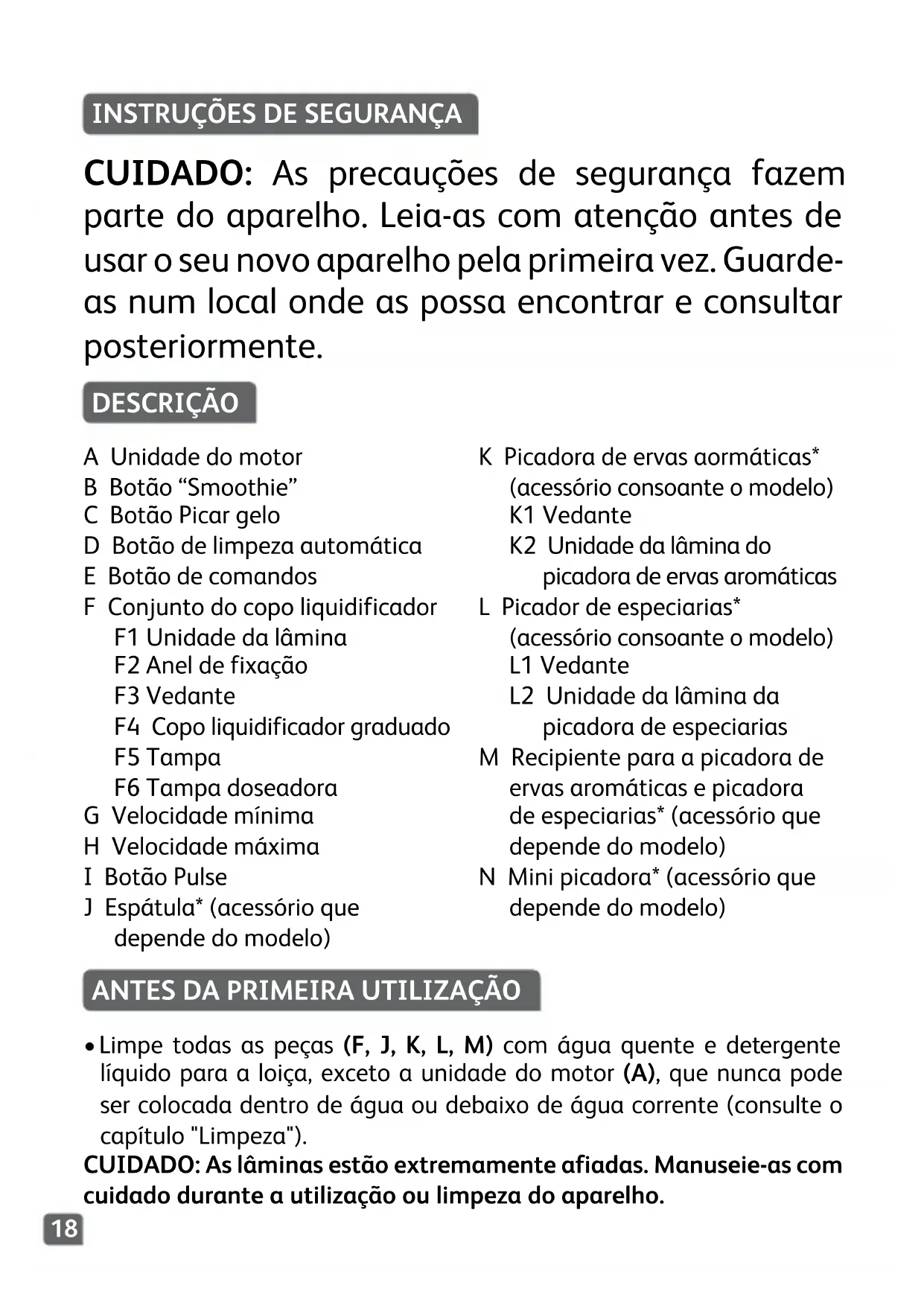 A Unidade do motor B Botão “Smoothie” C Botão Picar gelo D Botão de limpeza automática E Botão de comandos F Conjunto do copo liquidificador F1 Unidade da lâmina F2 Anel de fixação F3 Vedante F4 Copo liquidificador graduado F5 Tampa F6 Tampa doseadora G Velocidade mínima H Velocidade máxima I Botão Pulse J Espátula* (acessório que depende do modelo) K Picadora de ervas aormáticas* (acessório consoante o modelo) K1 Vedante K2 Unidade da lâmina do picadora de ervas aromáticas L Picador de especiarias* (acessório consoante o modelo) L1 Vedante L2 Unidade da lâmina da picadora de especiarias M Recipiente para a picadora de ervas aromáticas e picadora de especiarias* (acessório que depende do modelo) N Mini picadora* (acessório que depende do modelo) CUIDADO: As precauções de segurança fazem parte do aparelho. Leia-as com atenção antes de usar o seu novo aparelho pela primeira vez. Guarde- as num local onde as possa encontrar e consultar posteriormente.