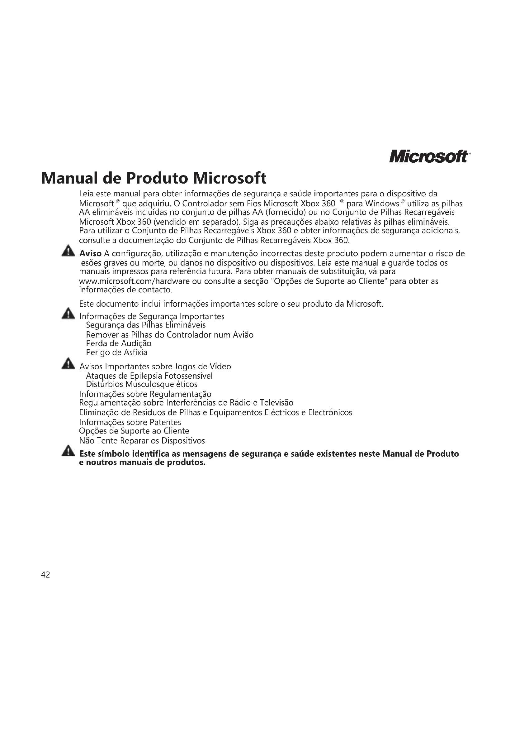 utiliza as pilhas AA elimináveis incluídas no conjunto de pilhas AA (fornecido) ou no Conjunto de Pilhas Recarregáveis Microsoft Xbox 360 (vendido em separado). Siga as precauções abaixo relativas às pilhas elimináveis. Para utilizar o Conjunto de Pilhas Recarregáveis Xbox 360 e obter informações de segurança adicionais, consulte a documentação do Conjunto de Pilhas Recarregáveis Xbox 360. Aviso A conguração, utilização e manutenção incorrectas deste produto podem aumentar o risco de lesões graves ou morte, ou danos no dispositivo ou dispositivos. Leia este manual e guarde todos os manuais impressos para referência futura. Para obter manuais de substituição, vá para www.microsoft.com/hardware ou consulte a secção "Opções de Suporte ao Cliente" para obter as informações de contacto. Este documento inclui informações importantes sobre o seu produto da Microsoft. Informações de Segurança Importantes Segurança das Pilhas Elimináveis Remover as Pilhas do Controlador num Avião Perda de Audição Perigo de Asxia Avisos Importantes sobre Jogos de Vídeo Ataques de Epilepsia Fotossensível Distúrbios Musculosqueléticos Informações sobre Regulamentação Regulamentação sobre Interferências de Rádio e Televisão Eliminação de Resíduos de Pilhas e Equipamentos Eléctricos e Electrónicos Informações sobre Patentes Opções de Suporte ao Cliente Não Tente Reparar os Dispositivos Este símbolo identica as mensagens de segurança e saúde existentes neste Manual de Produto e noutros manuais de produtos.