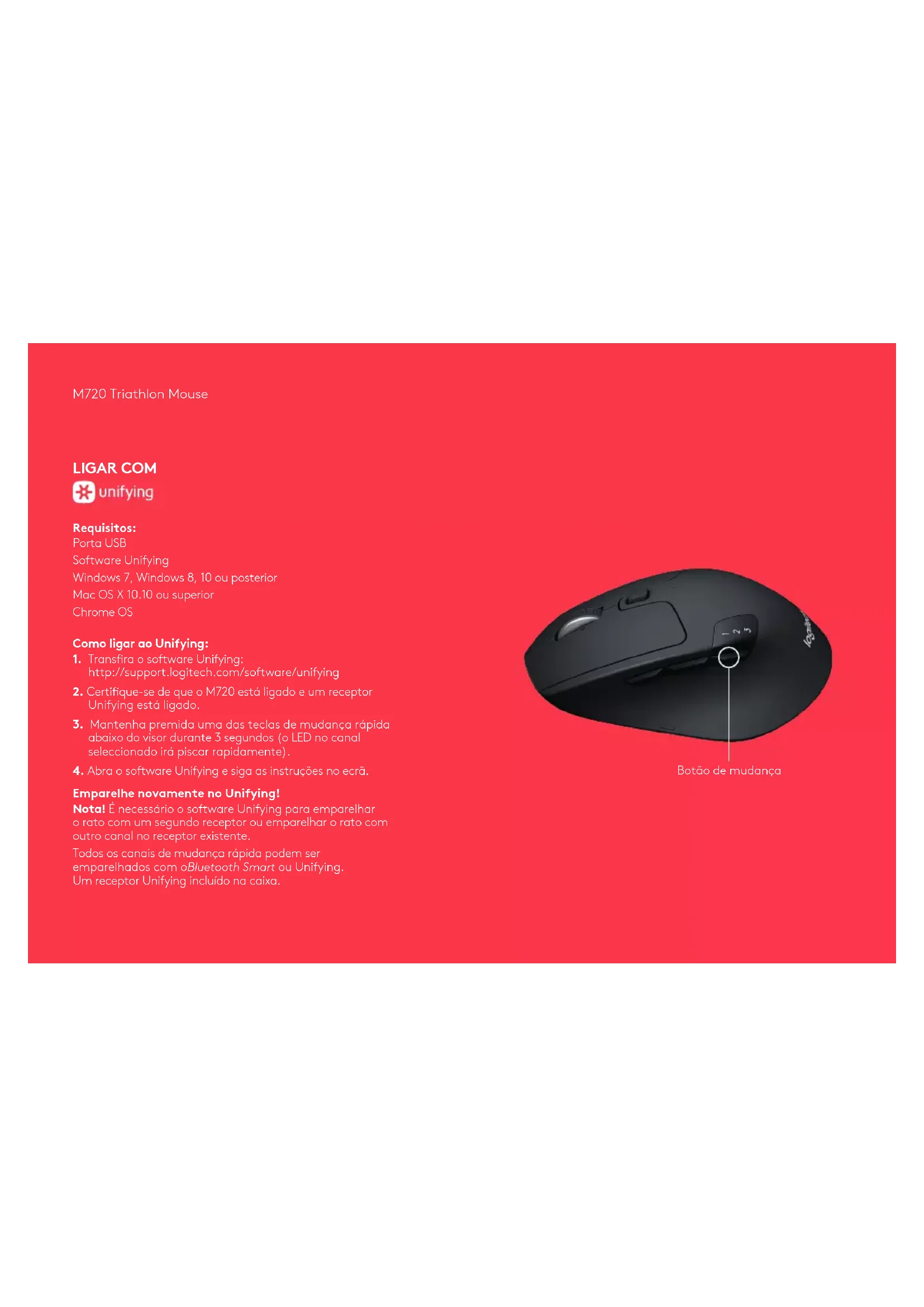 Emparelhe novamente no Unifying! Nota! É necessário o software Unifying para emparelhar o rato com um segundo receptor ou emparelhar o rato com outro canal no receptor existente. Todos os canais de mudança rápida podem ser emparelhados com oBluetooth Smart ou Unifying. Um receptor Unifying incluído na caixa. Botão de mudançaM720 Triathlon Mouse LIGAR COM Requisitos: O seu dispositivo deve suportar a tecnologia Bluetooth Smart – Windows 8 ou posterior – Mac OS X 10.10 ou superior – Android 5.0 ou posterior Como emparelhar um dispositivo Bluetooth:
