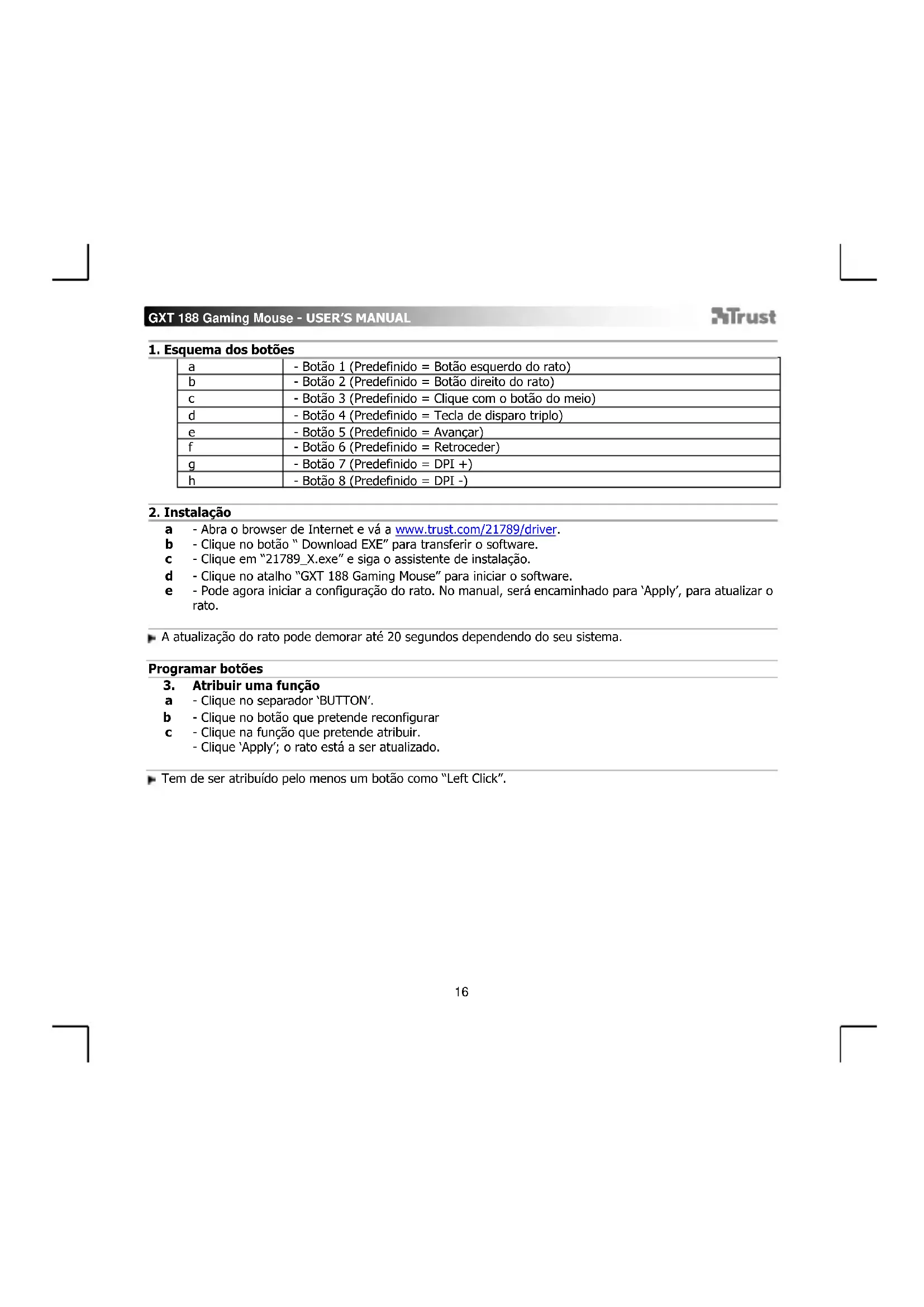 - Abra o navegador de Internet e vá até www.trust.com/21789/driver. - Clique no botão “Download EXE” para fazer o download do software. - Clique em “21789_X.exe” e siga o assistente de instalação. - Clique no atalho “GXT 188 Gaming Mouse” para iniciar o software. - Agora você pode começar a configurar o mouse. No manual constará “Apply” para atualizar o mouse. Atualizar o mouse pode levar até 20 segundos dependendo do seu sistema. Programação do botão